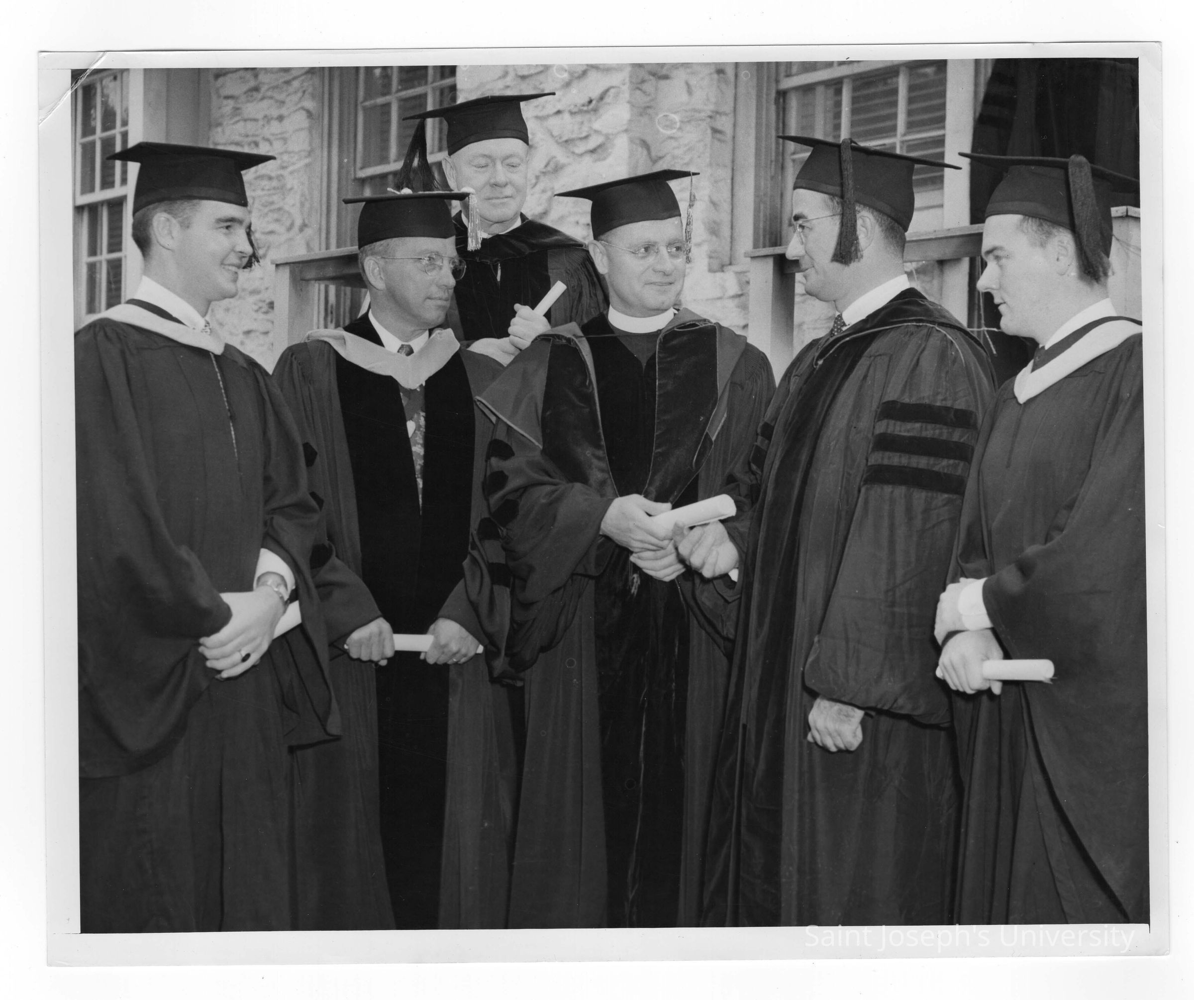 Edward G. Jacklin, S.J. with Charles W. Perelle, James C. Ganey, Francis C. Nash, Francis Dieter, and John Molloy at 1952 graduation/commencement. (Four black and white prints.)