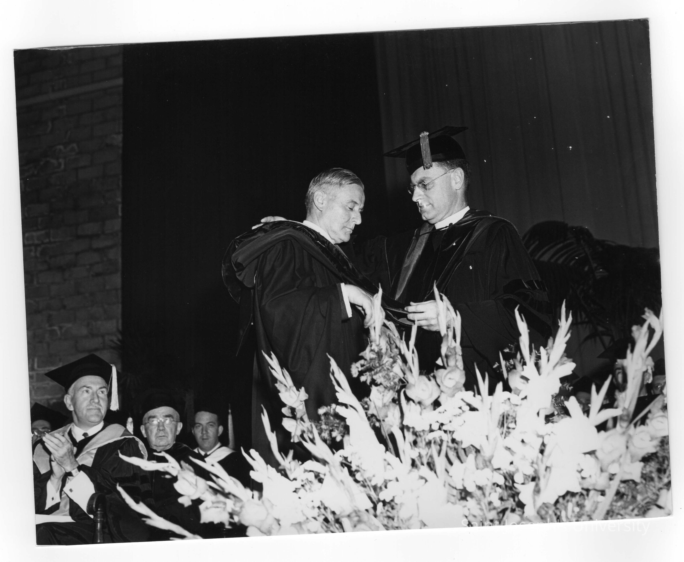 Edward G. Jacklin,S.J., bestowing honorary degree on John J. Hearne with John McShain and Joseph S. Hogan, S.J. looking on during 1953 graduation/commencement ceremony.