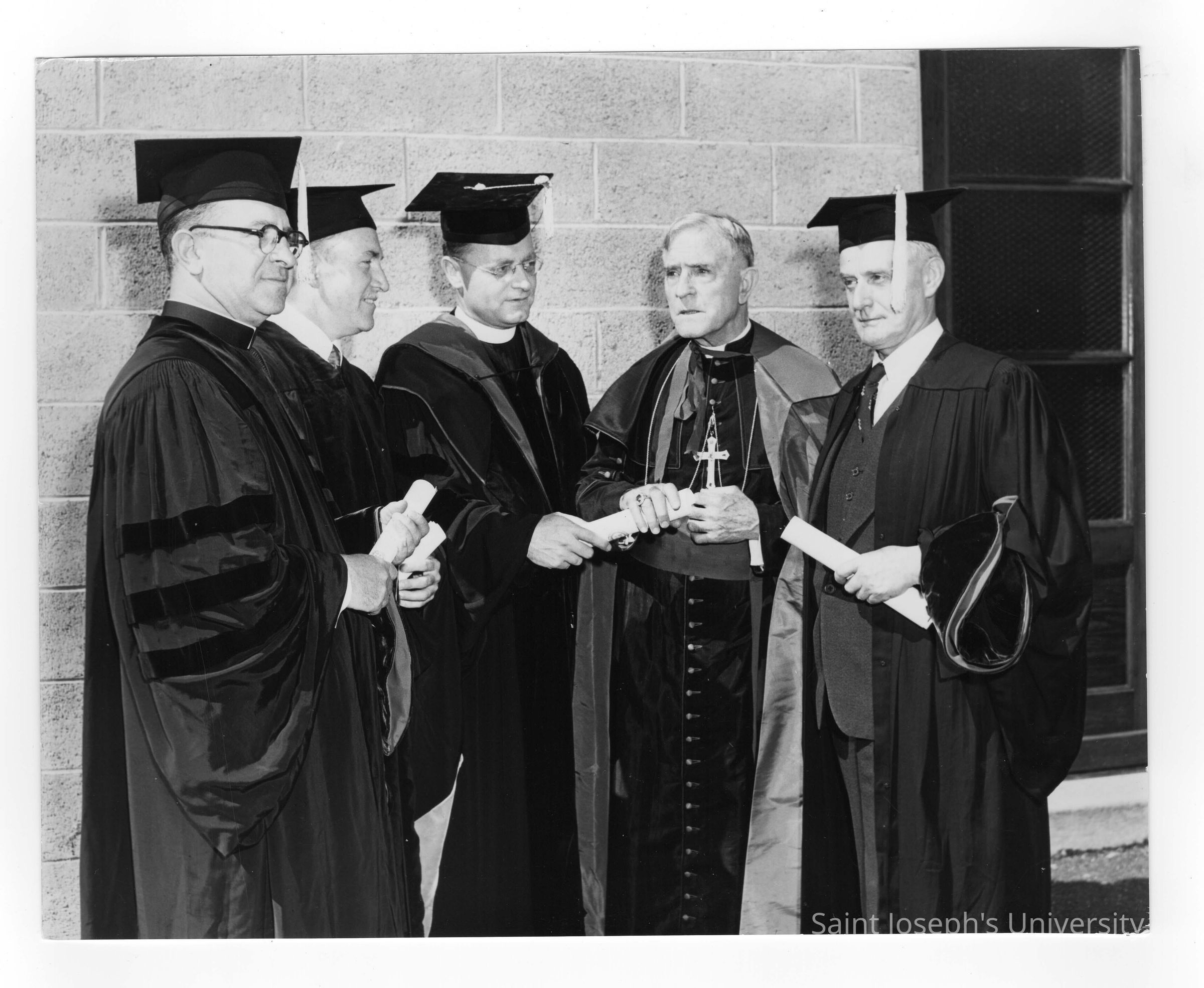 Edward G. Jacklin, S.J. with four honorary degree recipients, John McShain, Reverend John J. Maher, Bishop Daniel f. Gercke, and John J. Hearne at 1953 graduation/commencement.