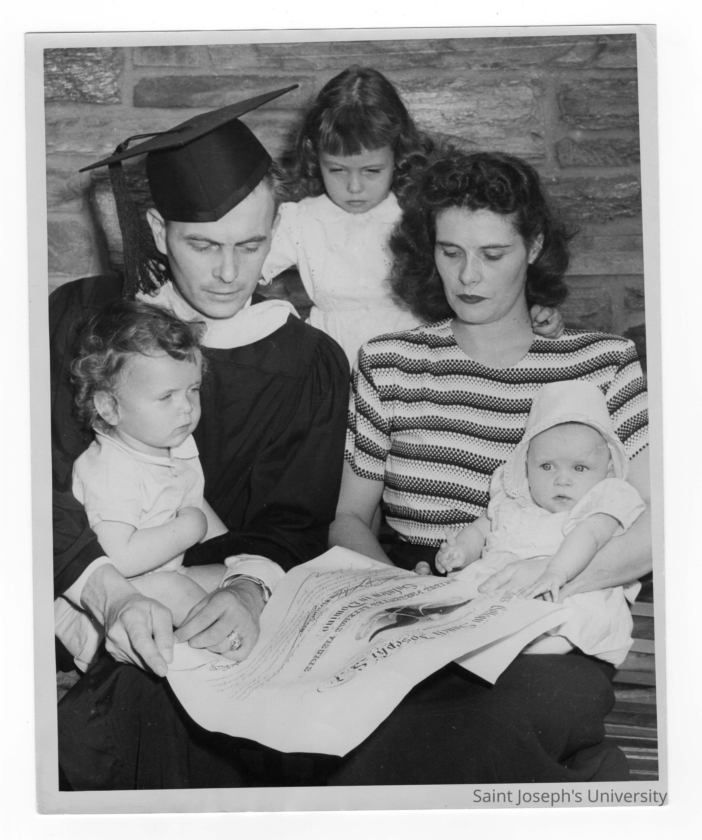 Graduating student, Joseph D. Flaherty, with his wife and three children during 1949 graduation/commencement.