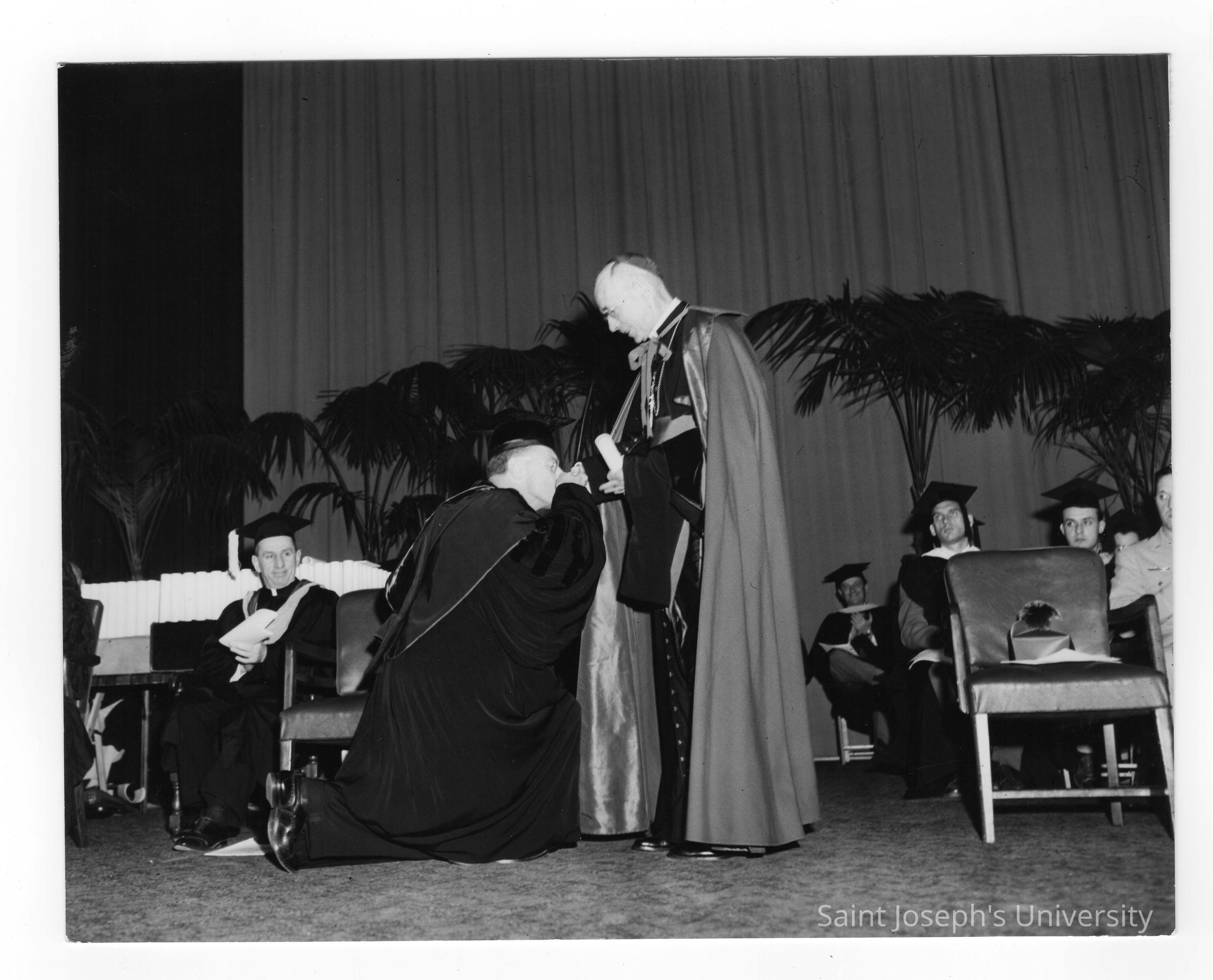 Edward G. Jacklin, S.J., kissing ring of Bishop John J. O'Hara during 1954 graduation/commencement ceremony.