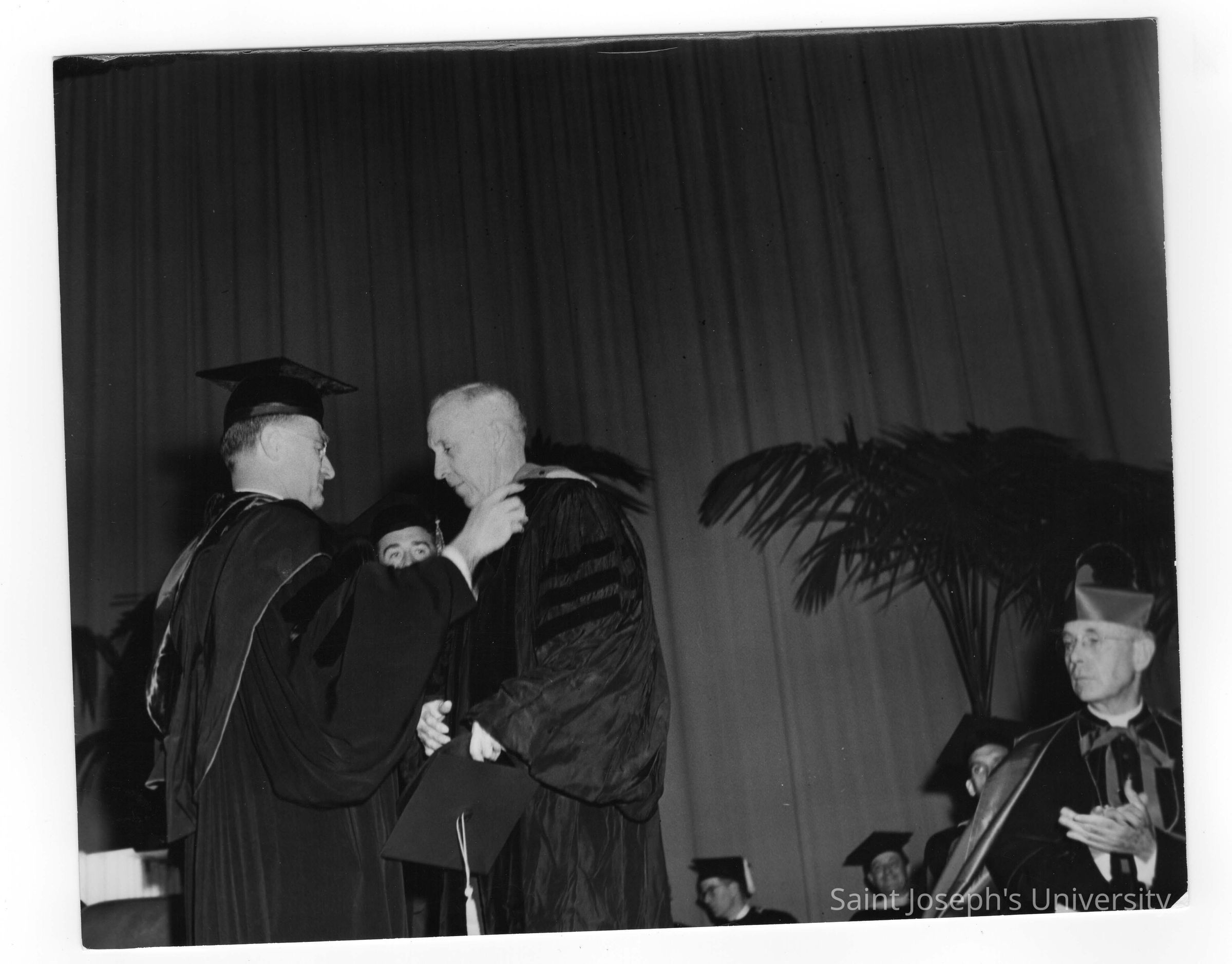 Edward G. Jacklin, S.J. bestowing honorary degree on Francis J. Hardart during 1954 graduation/commencement ceremony with Bishop John F. O'Hara looking on.