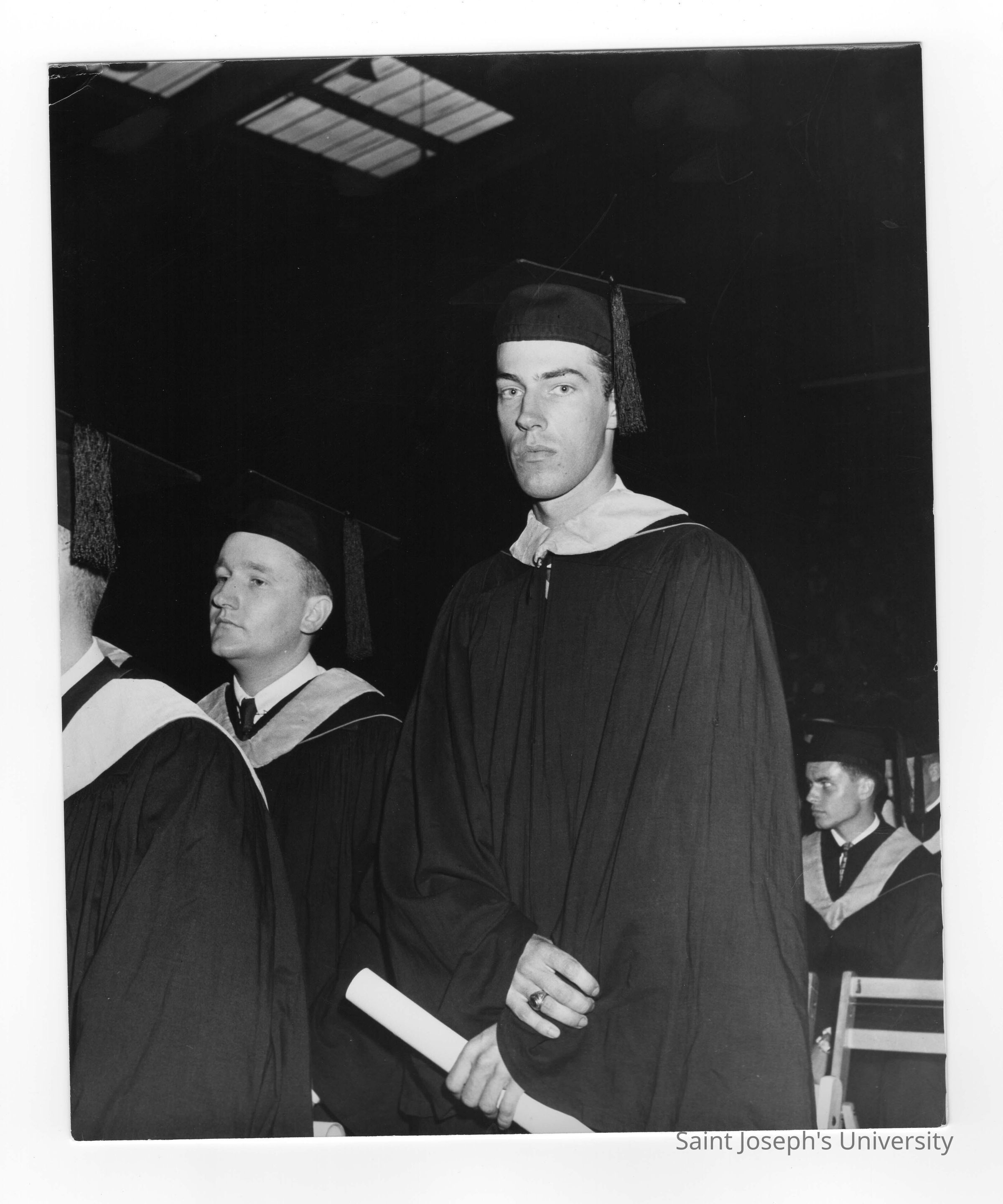 View of James M. Mulligan, honor student, and other graduates during 1954 graduation/commencement ceremony in Field House.