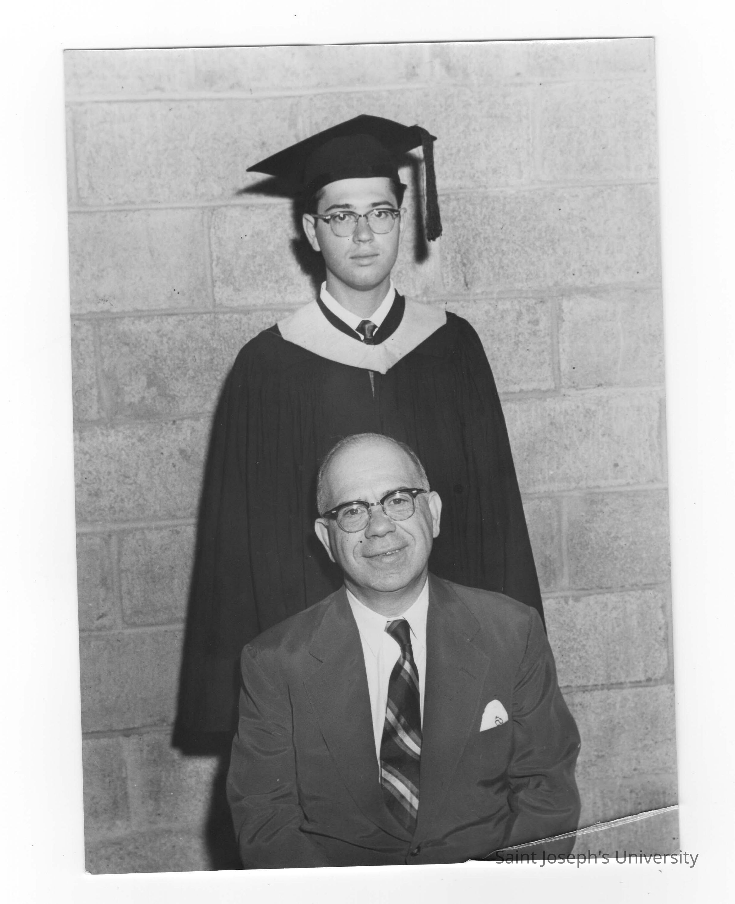Graduating student, Joseph J. Scarano, with his alumnus father, Dr. Joseph A. Scarano, class of 1927, at 1954 graduation/commencement.