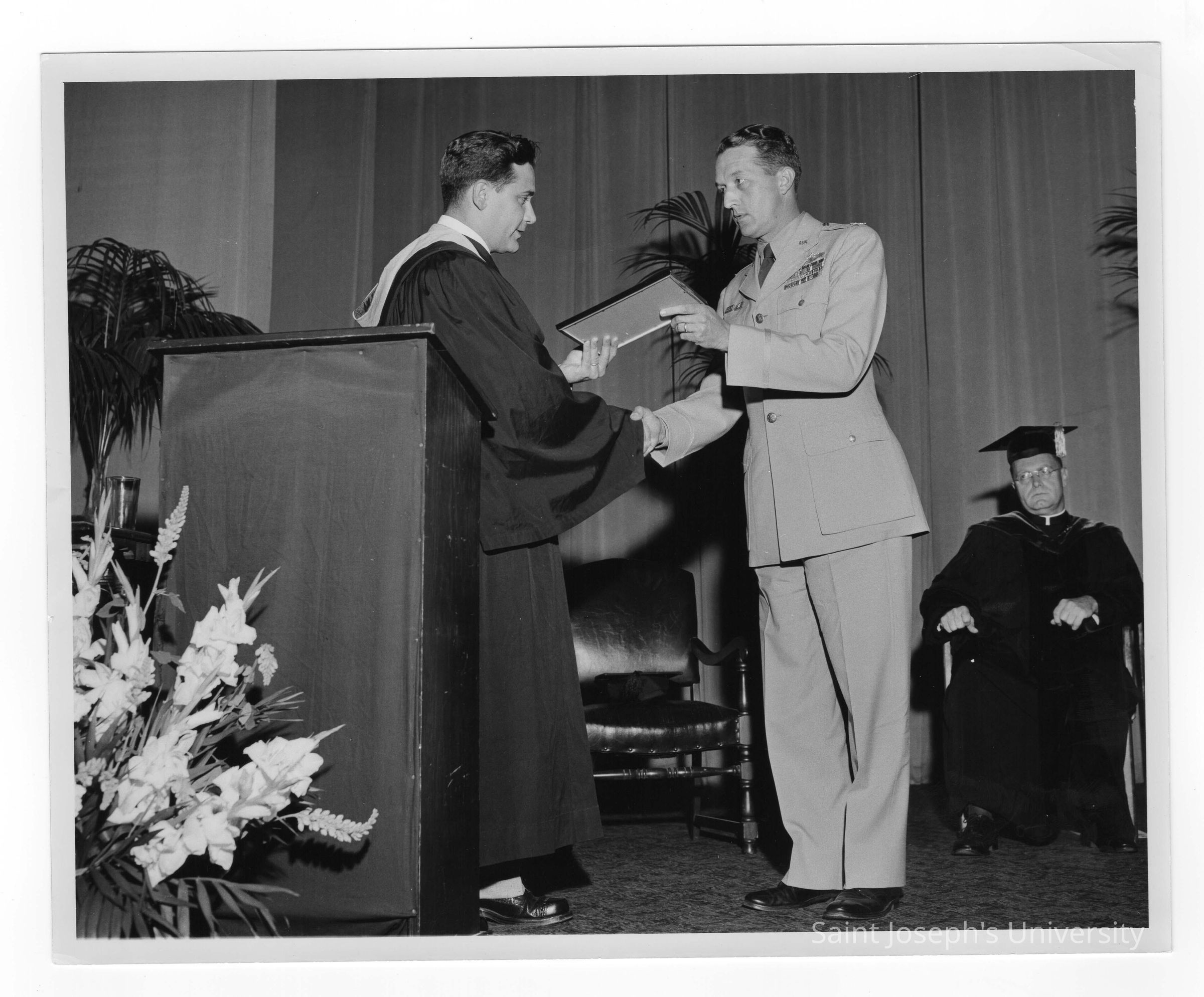Tropaia exercises at 1955 graduation/commencement with Alumni President Ariano presenting award to Colonel Raymond Gehrig.