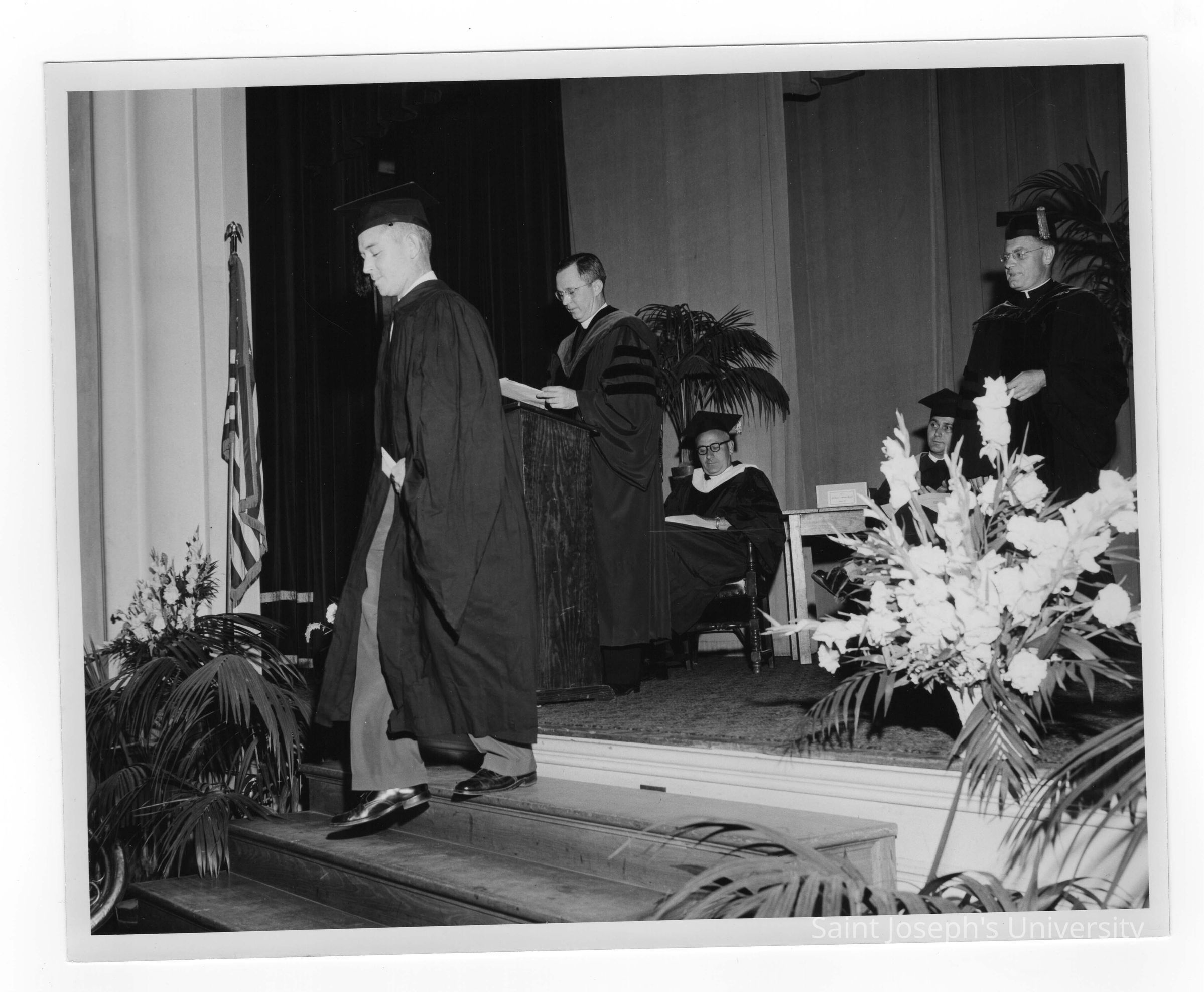 Tropaia exercises during 1955 graduation/commencement with Edward G. Jacklin, S.J., Matthew Sullivan, S.J., student, and others.