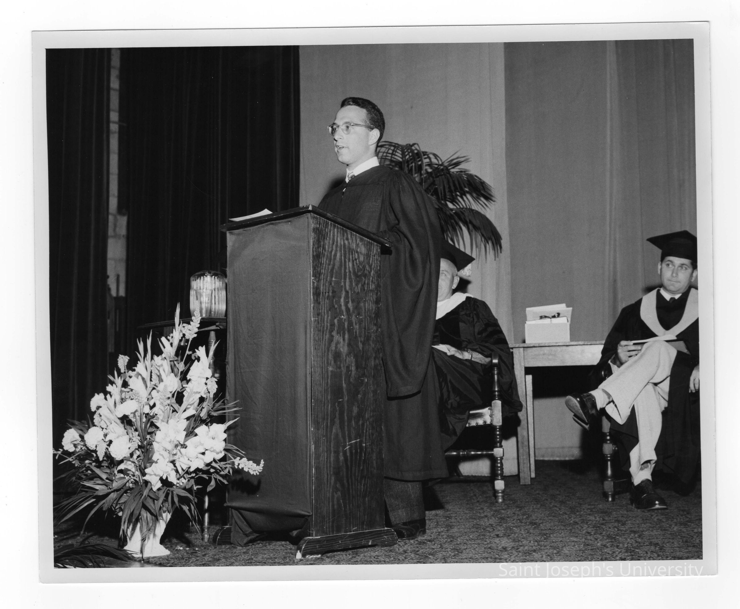 Tropaia exercises during 1955 graduation/commencement with Dominic Roberti giving class history at podium.