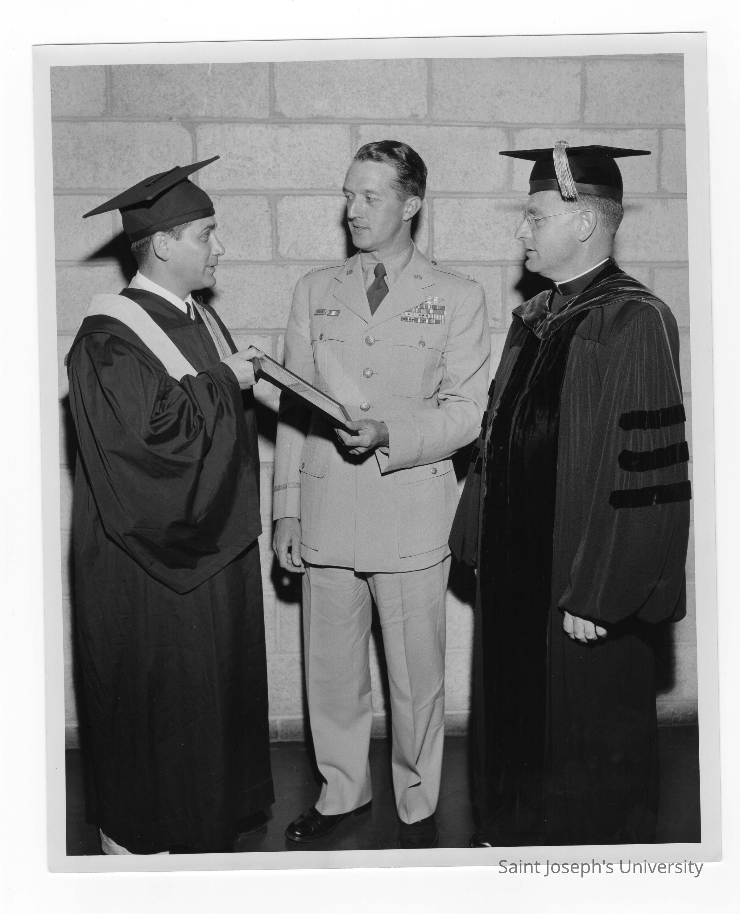 Tropaia exercises during 1955 graduation/commencement with Alumni President, W. Ariano, Edward G. Jacklin, S.J., and military officer after ceremony.