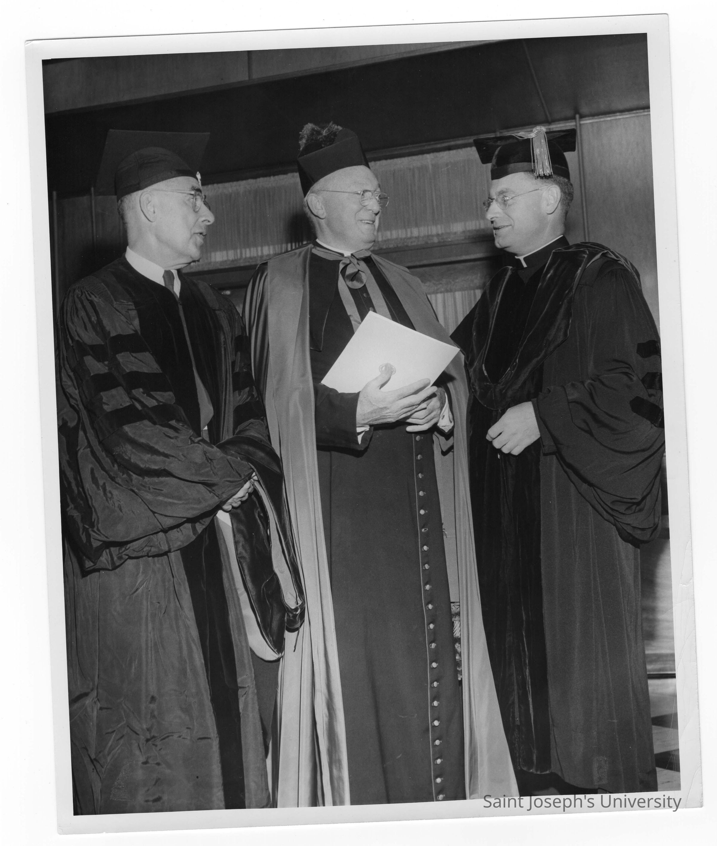 Edward G. Jacklin, S.J., with two honorary degree recipients, Joseph C. Cox, Sr. and Monsignor John J. Daly, during 1955 graduation/commencement.