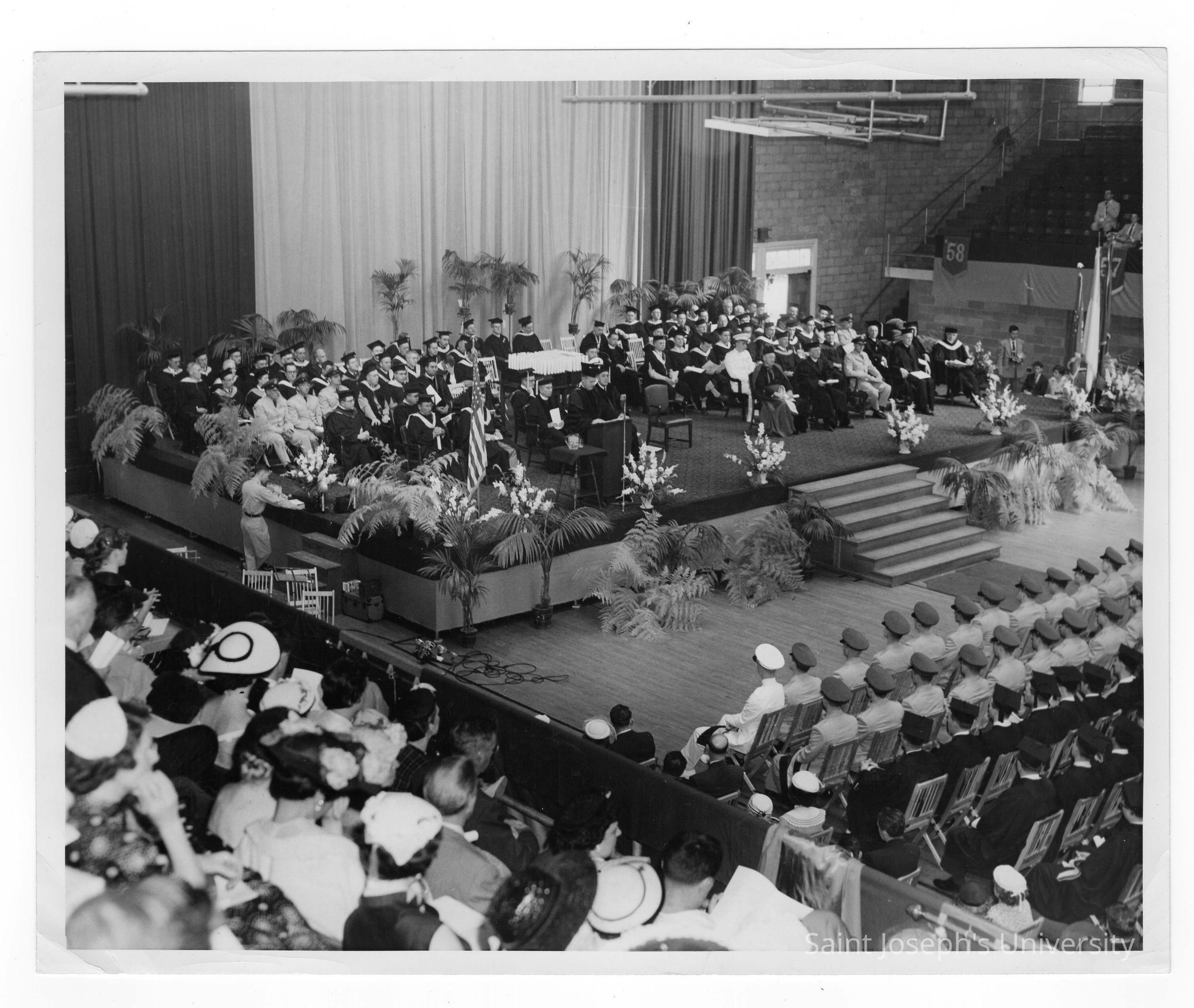 View of 1955 graduation/commencement ceremony in Field House. Two black and white prints.