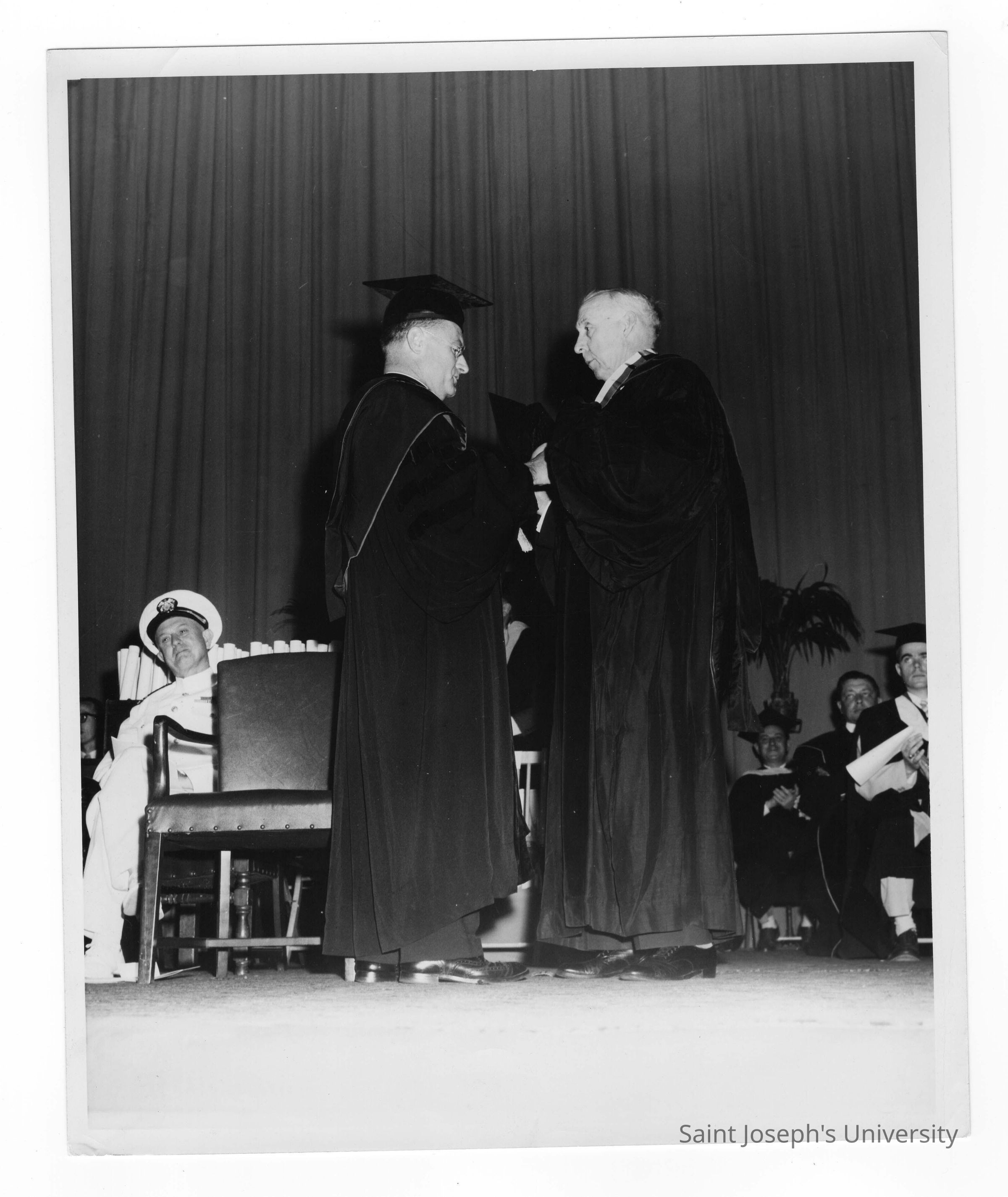 Edward G. Jacklin, S.J., conferring honorary degree to Bernard C. Duffy? during graduation/commencement ceremony, possibly in 1955. Two black and white prints.