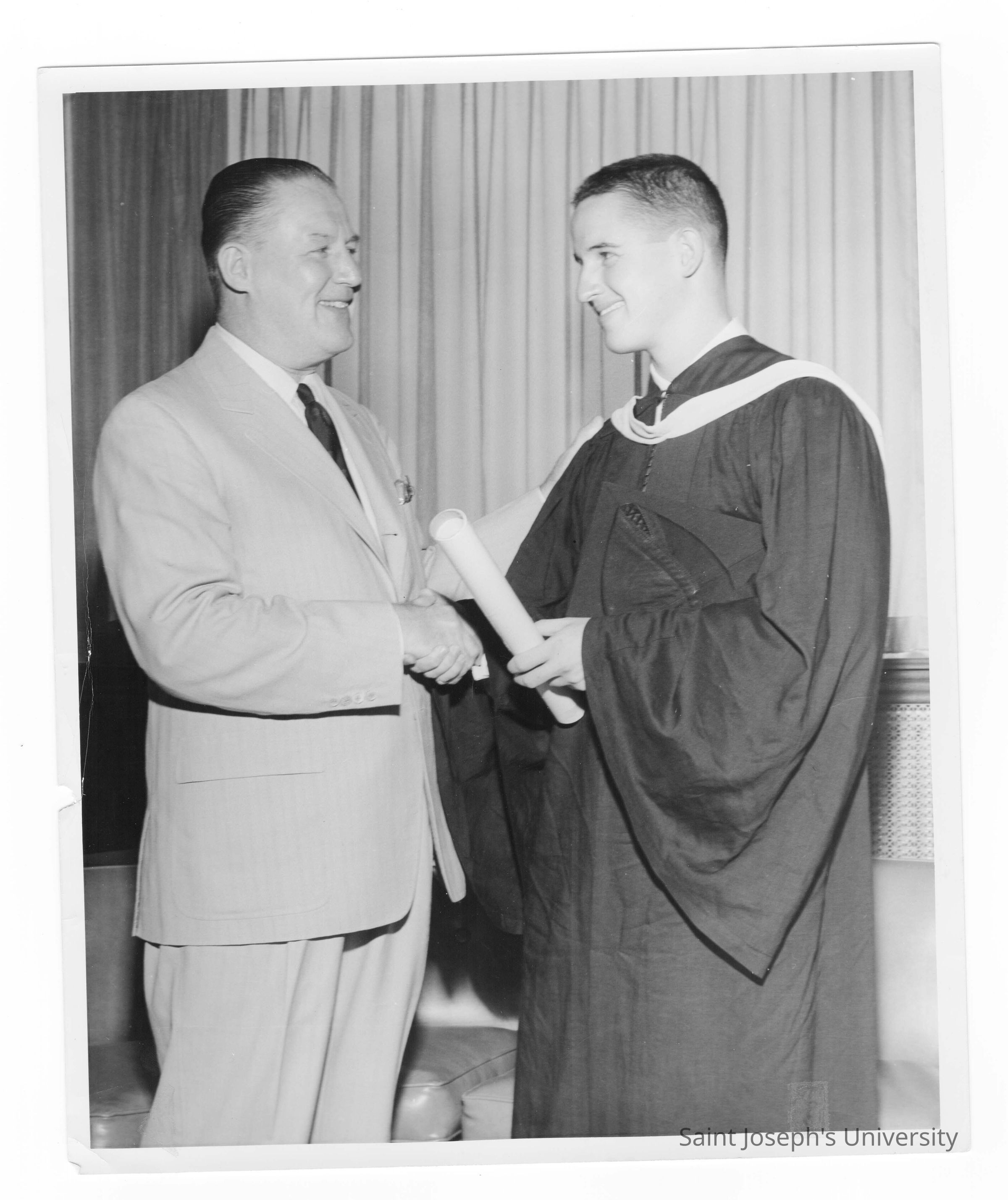Graduating student, James Phillips Mallie, with his alumnus father, James McG. Mallie, Esq. (class of 1927) during 1955 graduation/commencement.