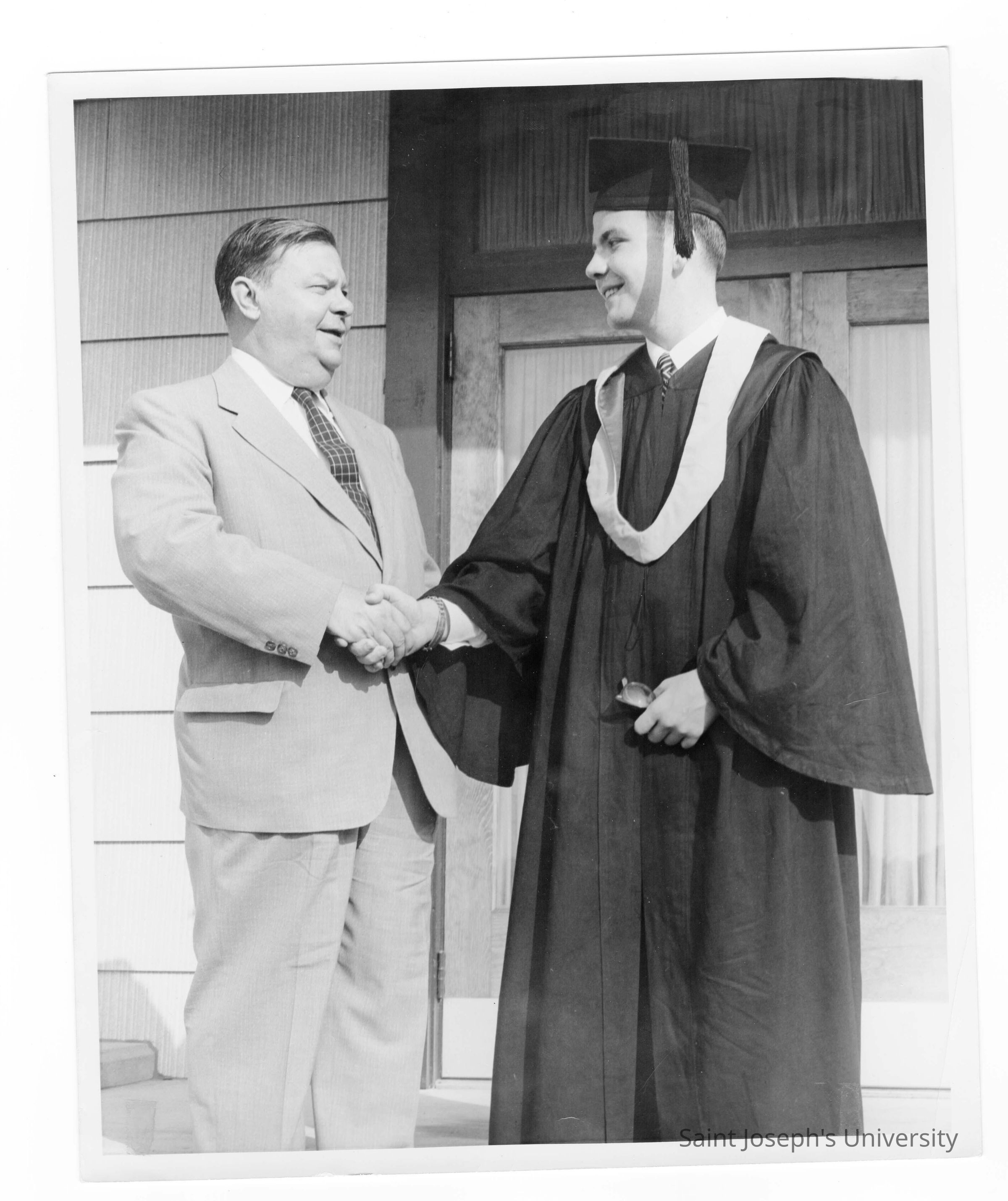 Graduating student, Maurice John Ward, Jr., with his alumnus father, Dr. Maurice J. Ward, Sr., class of 1927, during 1955 graduation/commencement ceremony.