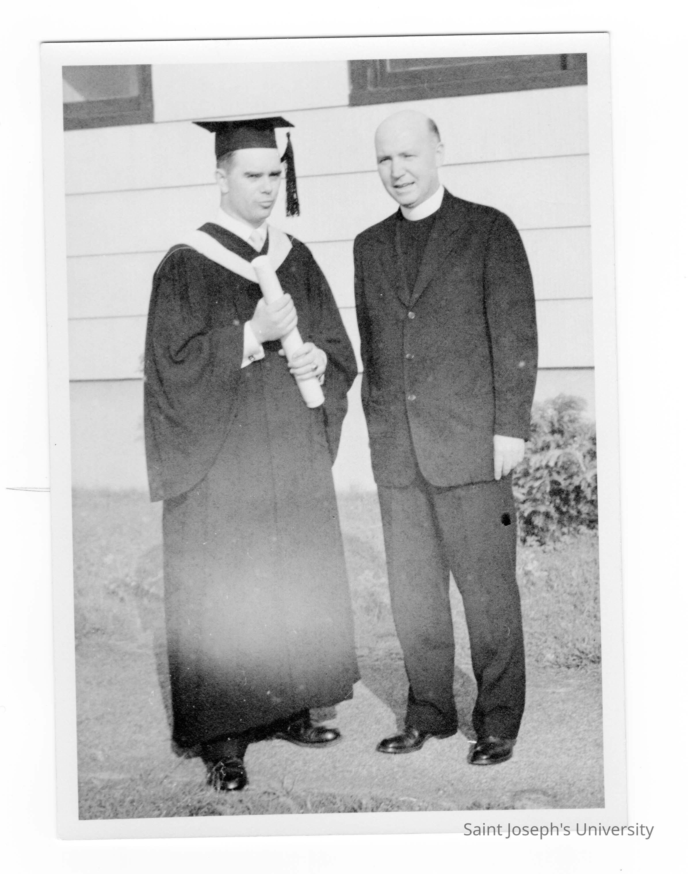 Graduated student standing with priest in front of the cardboard college after 1955 graduation/commencement cerermony.