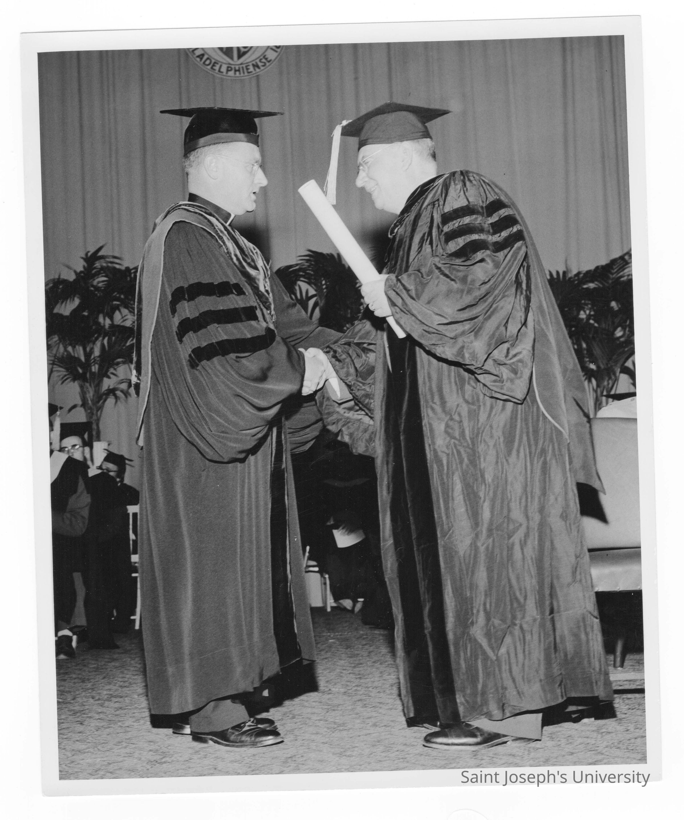 Edward G. Jacklin, S.J. awarding honorary degree to Leo L. Tully during 1956 graduation/commencement ceremony.