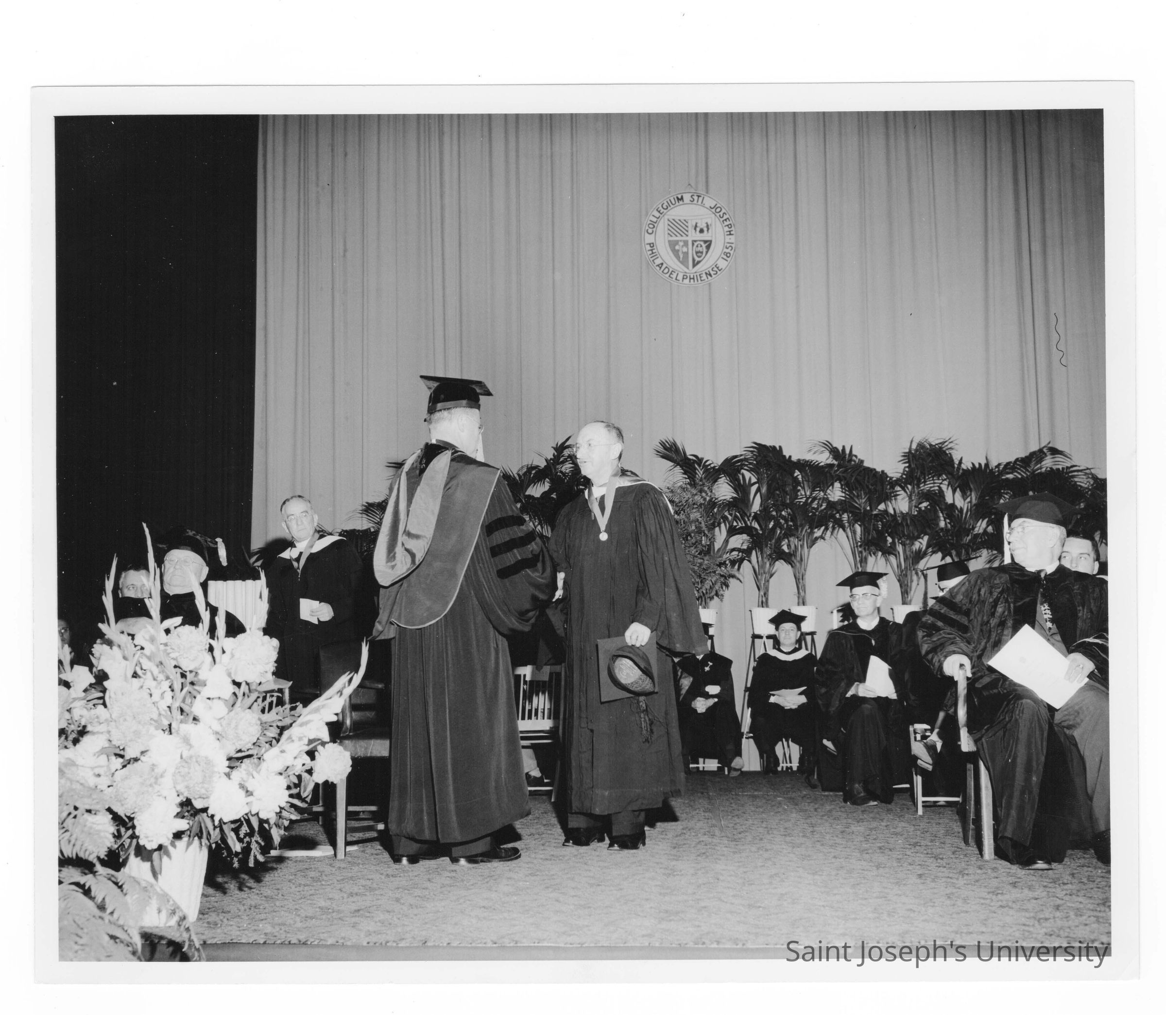Edward G. Jacklin, S.J., congratulating honoree during 1956 graduation/commencement ceremony.