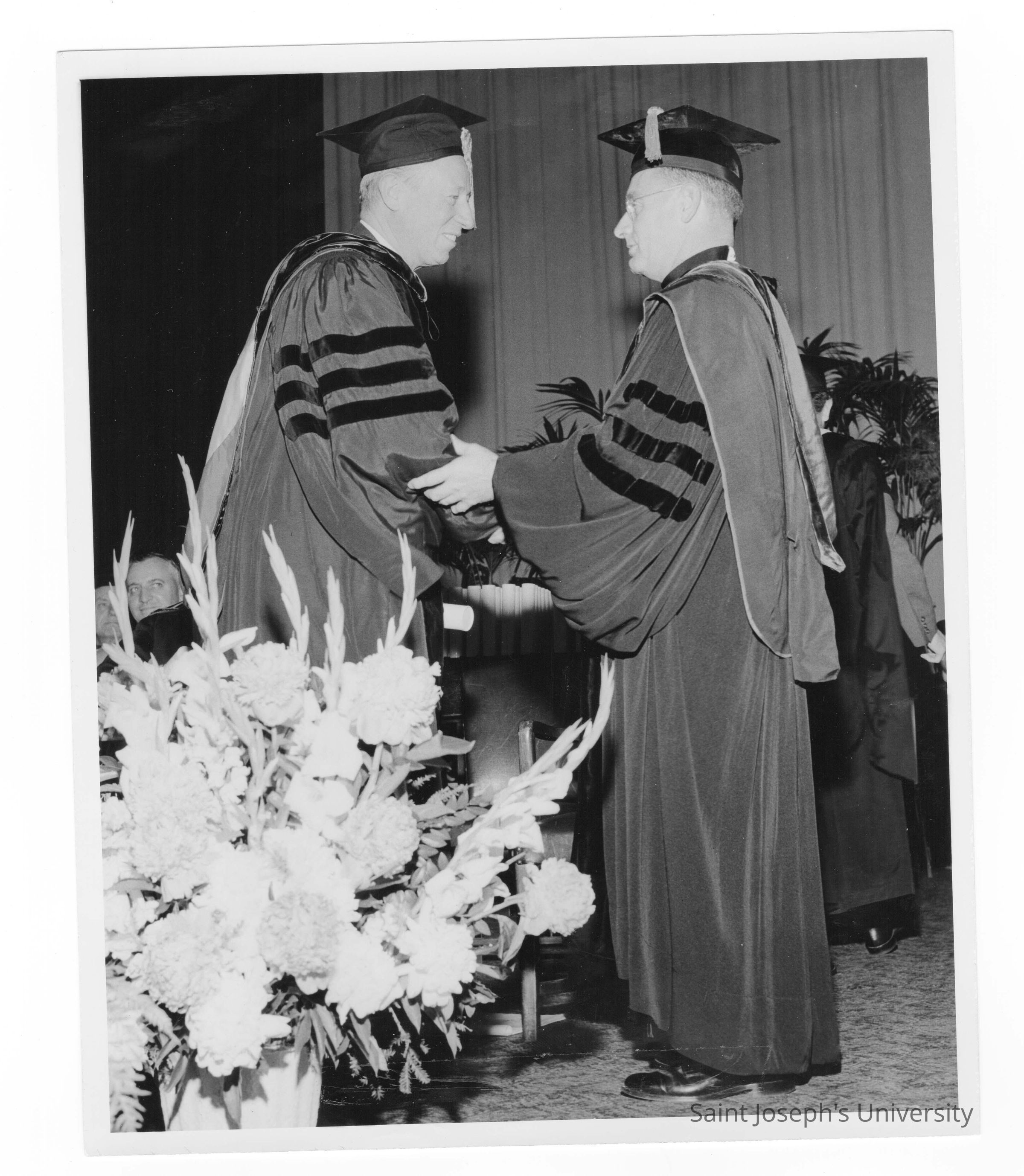Edward G. Jacklin, S.J., congratulating honoree during 1956 graduation/commencement ceremony.