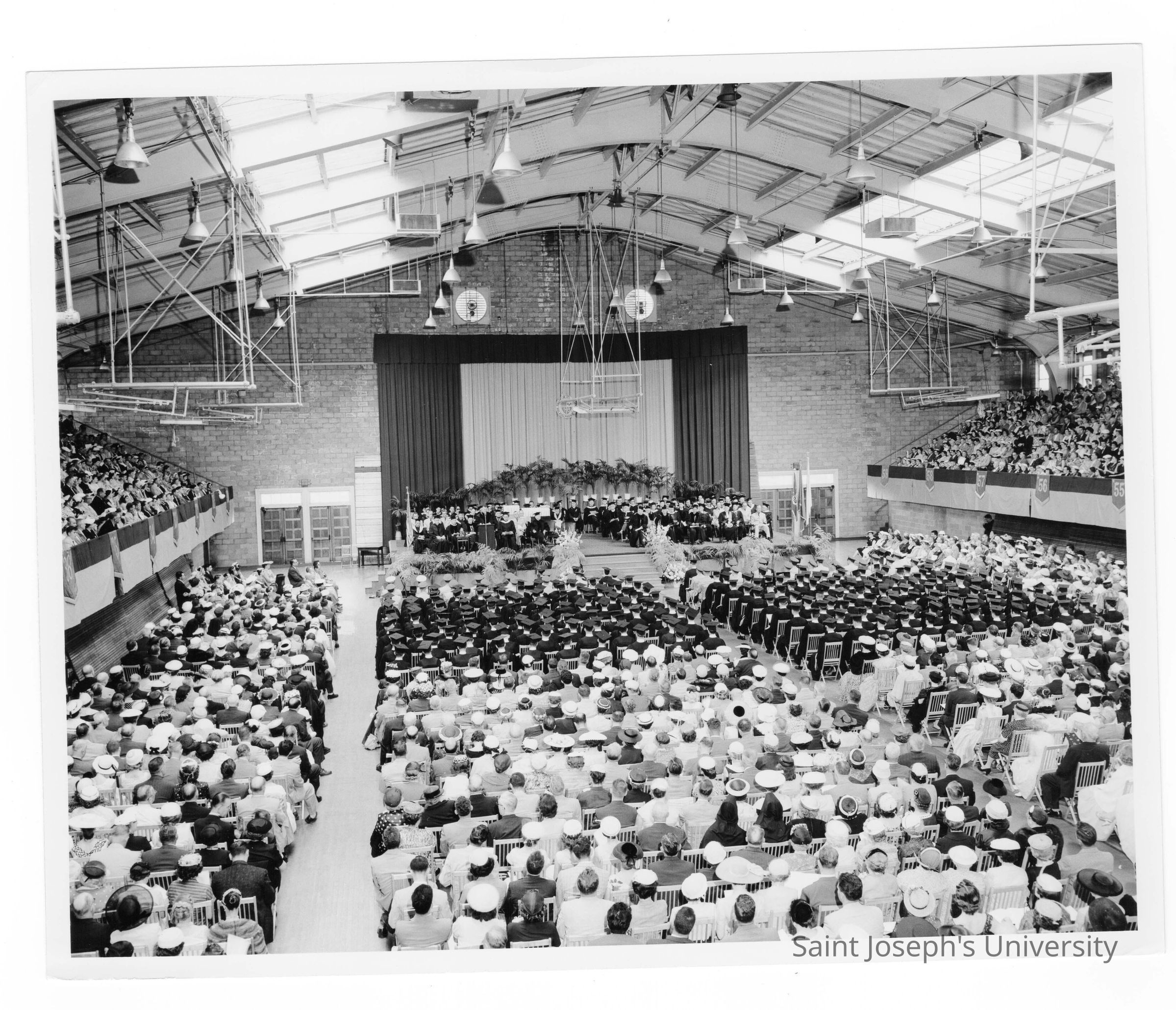 Interior view of 1956 graduation/commencement ceremony in Field House.