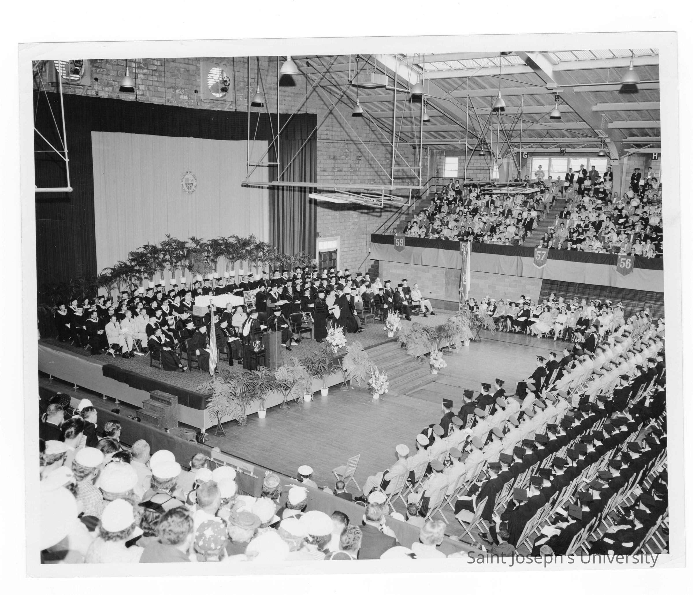 Interior view of 1956 graduation/commencement ceremony in Field House.