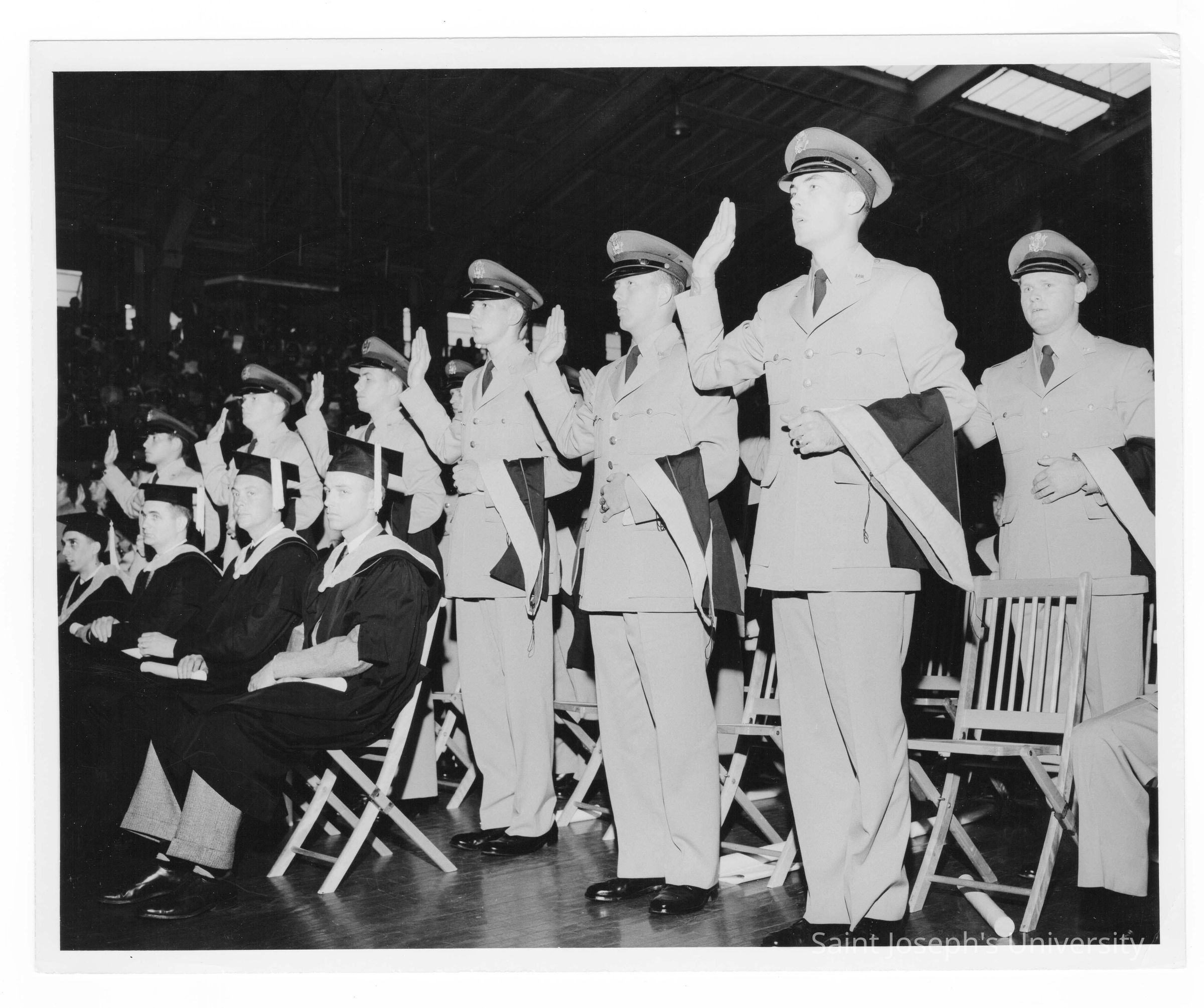 Commissioning of Air Force ROTC graduates during 1956 graduation/commencement ceremony in Field House.
