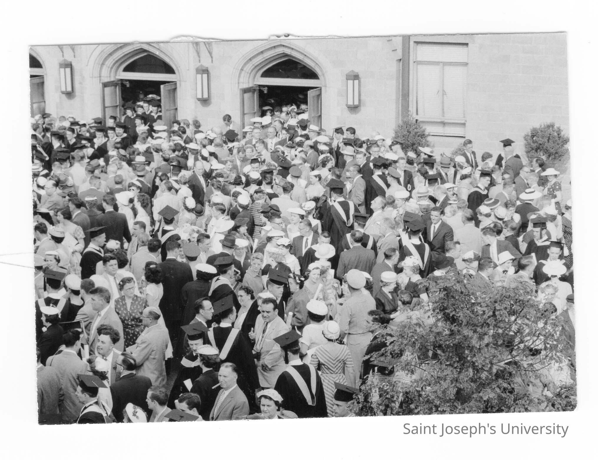 Crowd of graduates and guests outside Field House after 1956 graduation/commencement ceremony.