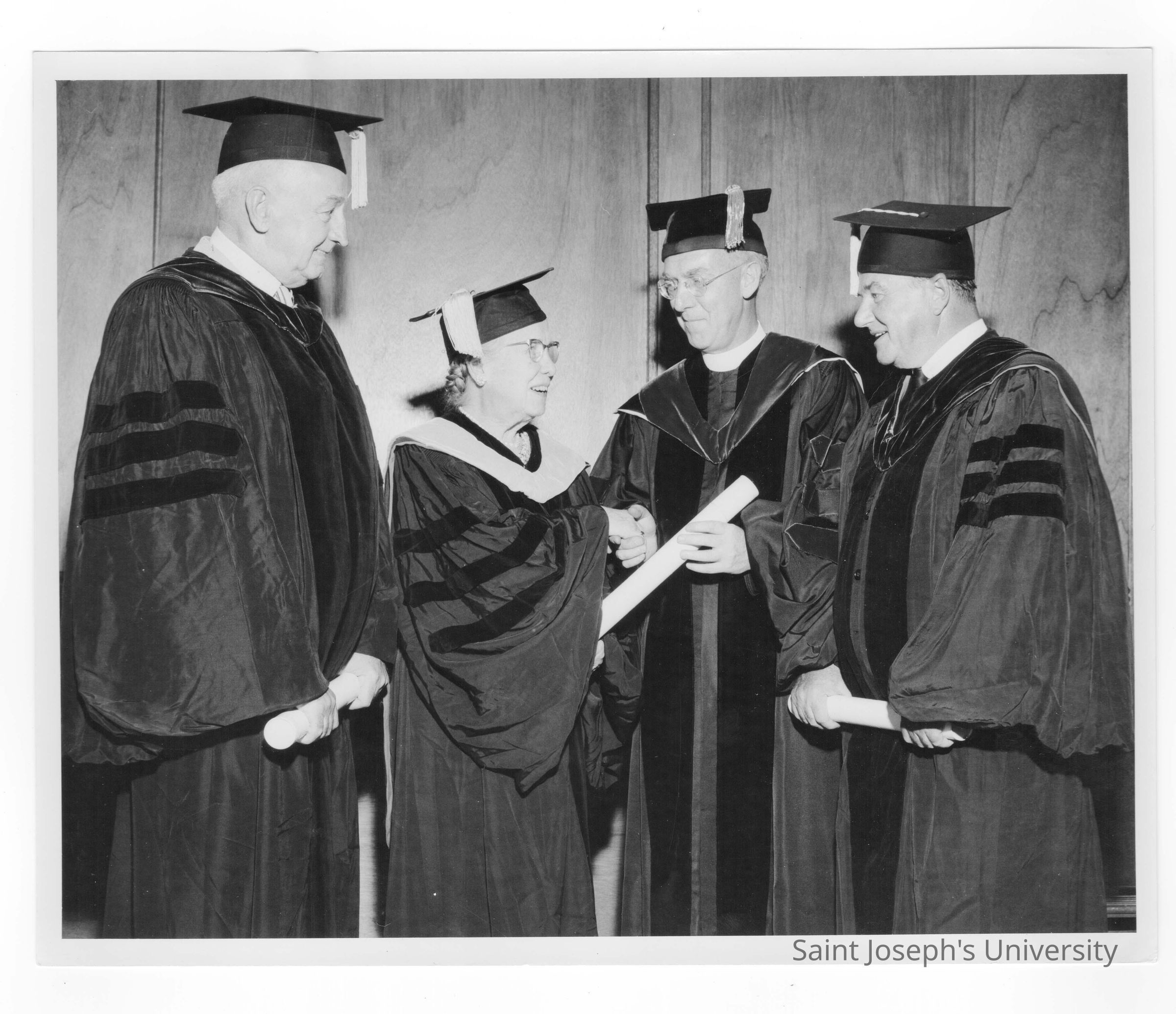 J. Joseph Bluett, S.J., with honorary degree recipients, Laura Leggett Barnes, Frank Casey, and Charles Carvin, during 1957 graduation/commencement.