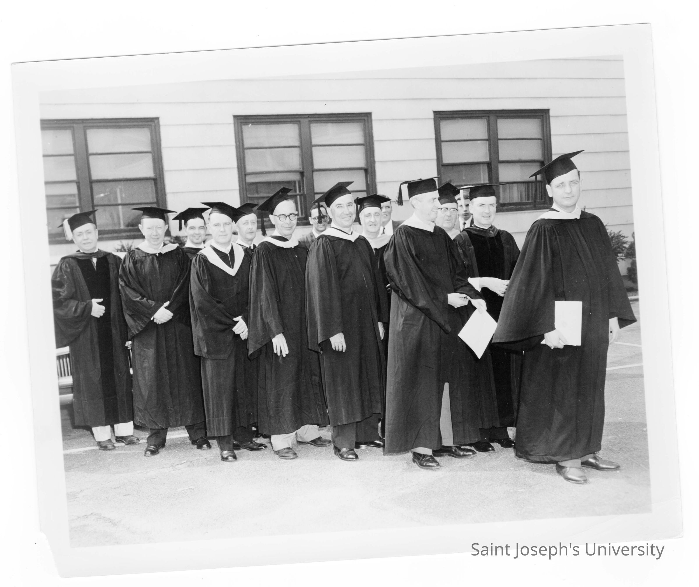 Members of the class of 1933 in cap and gown standing in front of Cardboard College prior to ceremony marking their twenty-fifth anniversary during 1958 graduation/commencement.