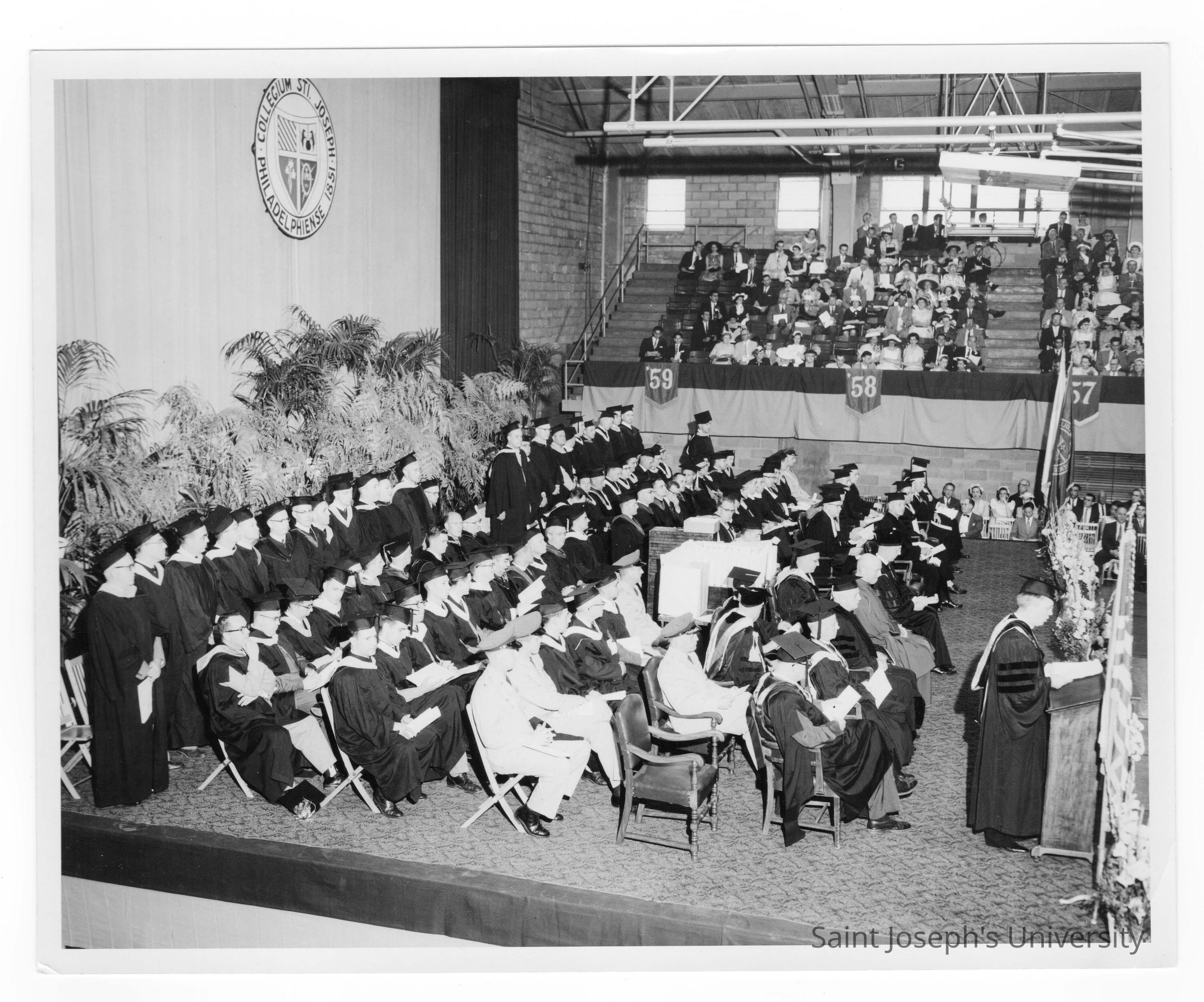Interior view of 1958 graduation/commencement ceremony in Field House.