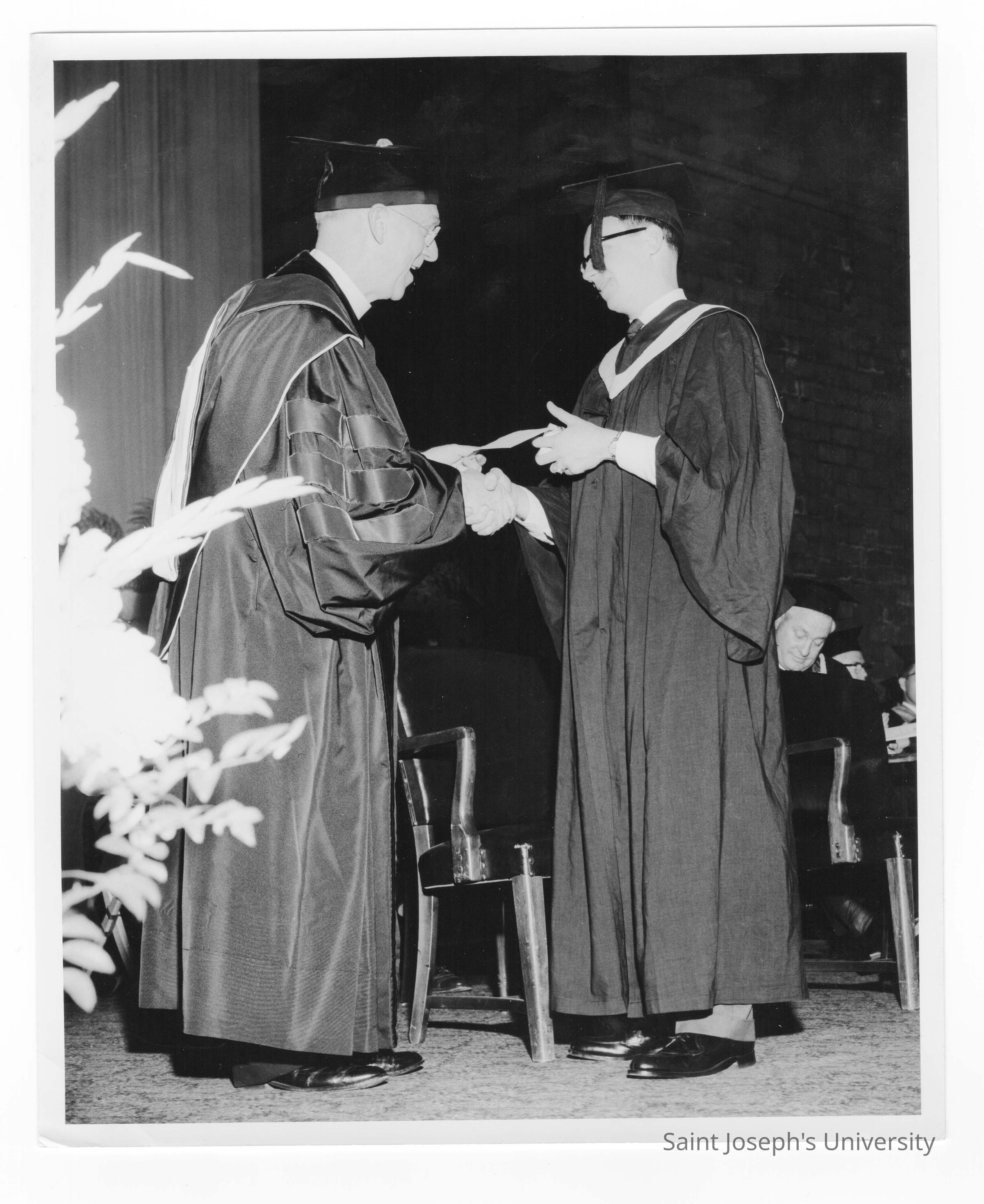 J. Joseph Bluett, S.J., congratulating honnor graduate during 1958 graduation/commencement ceremony.
