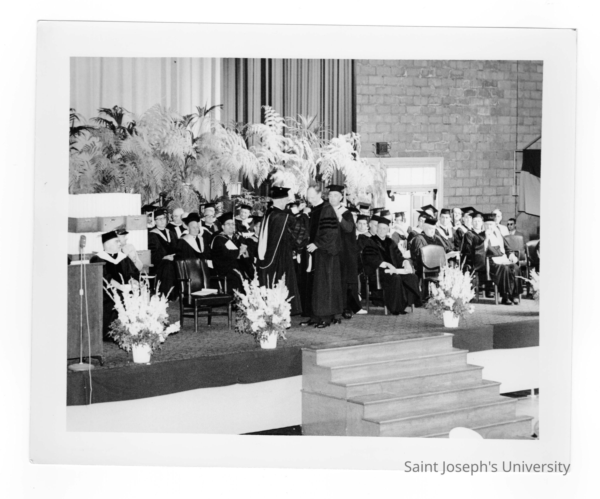 J. Joseph Bluett, S.J., conferring honorary degree to John F. Horstmann (?) during 1959 graduation/commencement ceremony.