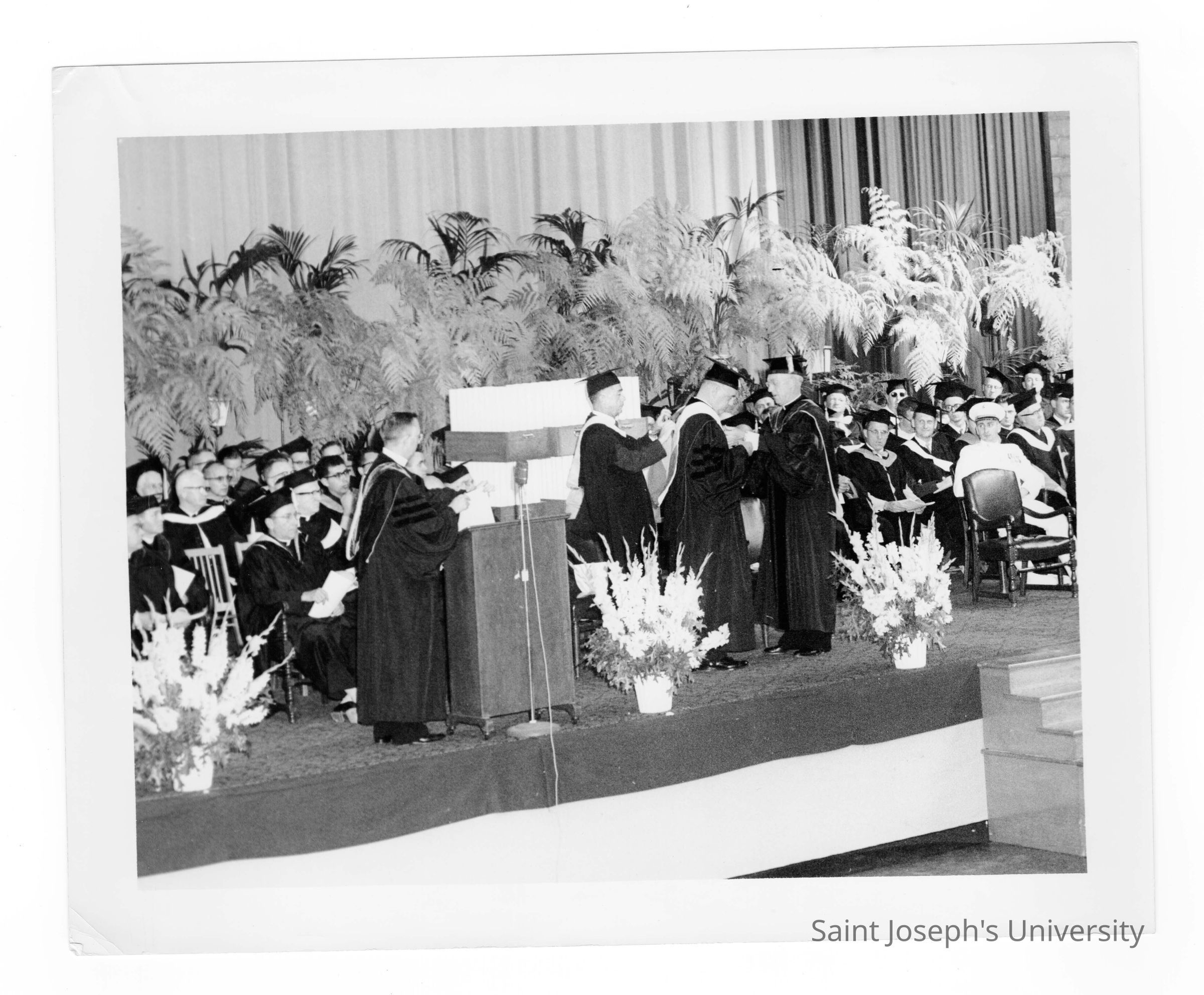 J. Joseph Bluett, S.J. conferring to James A. Donnellon, O.S.A. (?) President of Villanova University during 1959 graduation/commencement.