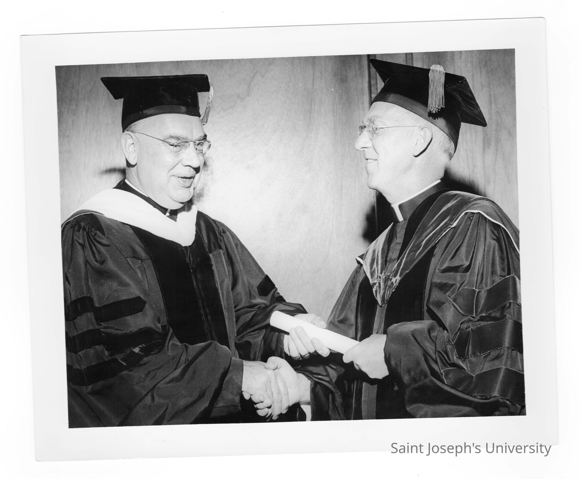 J. Joseph Bluett, S.J., with honorary degree recipient James A. Donnellon, O.S.A. (?), President of Villanova University during 1959 graduation/commencement.