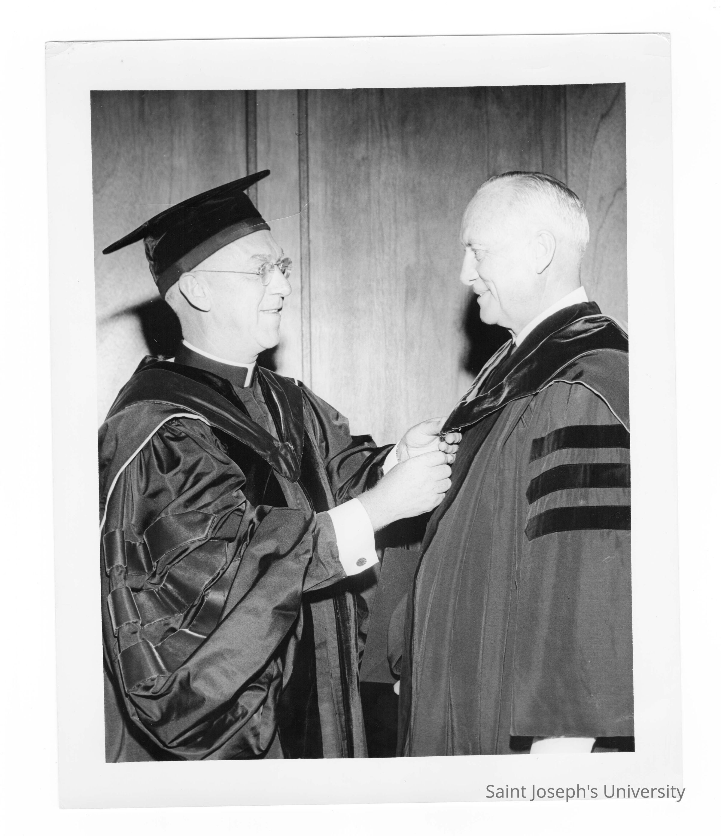 J. Joseph Bluett, S.J. with honorary degree recipient during 1959 graduation/commencement.