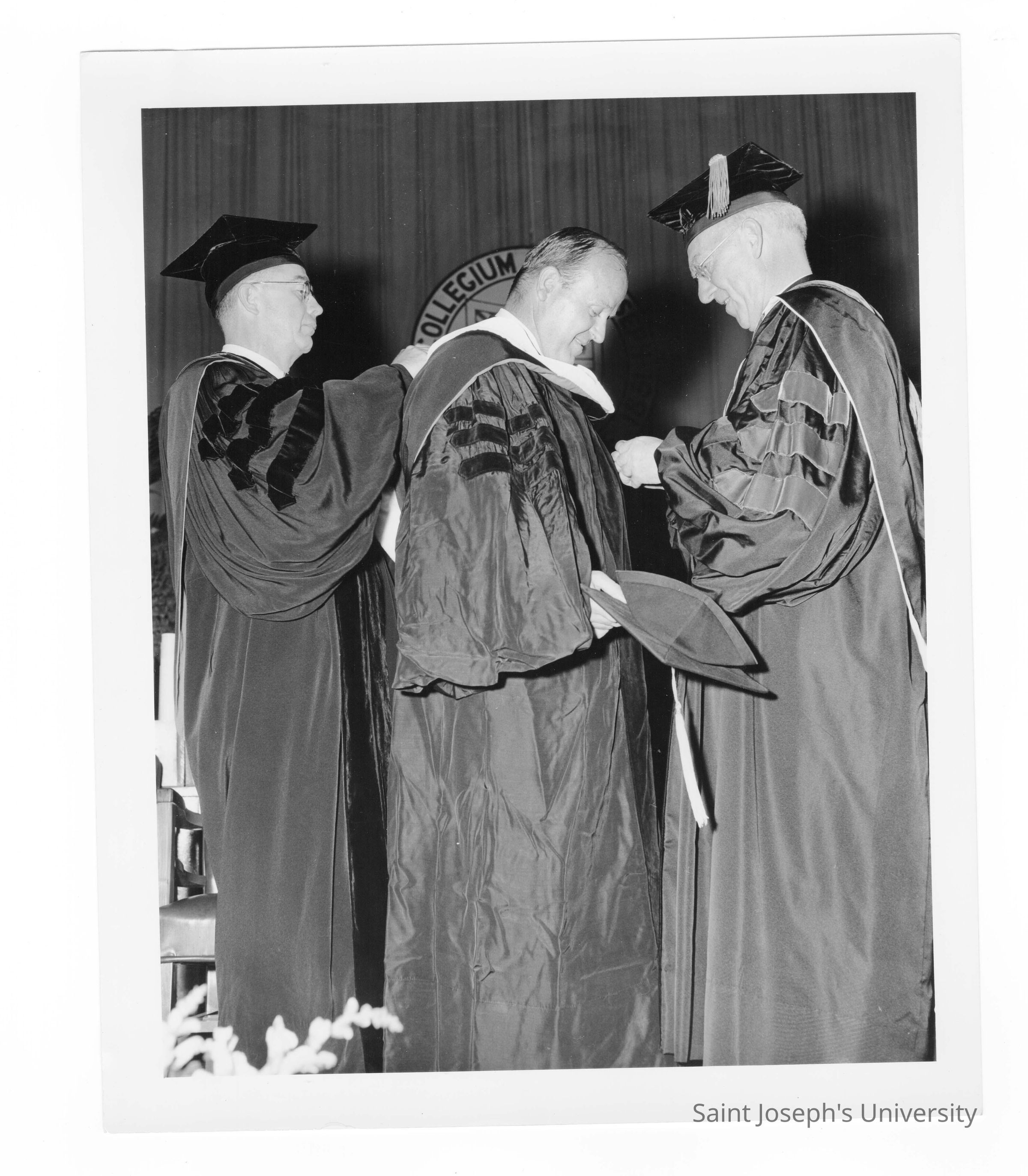 J. Joseph Bluett, S.J., conferring honorary degree to Augustus Long during 1961 graduation/commencement.