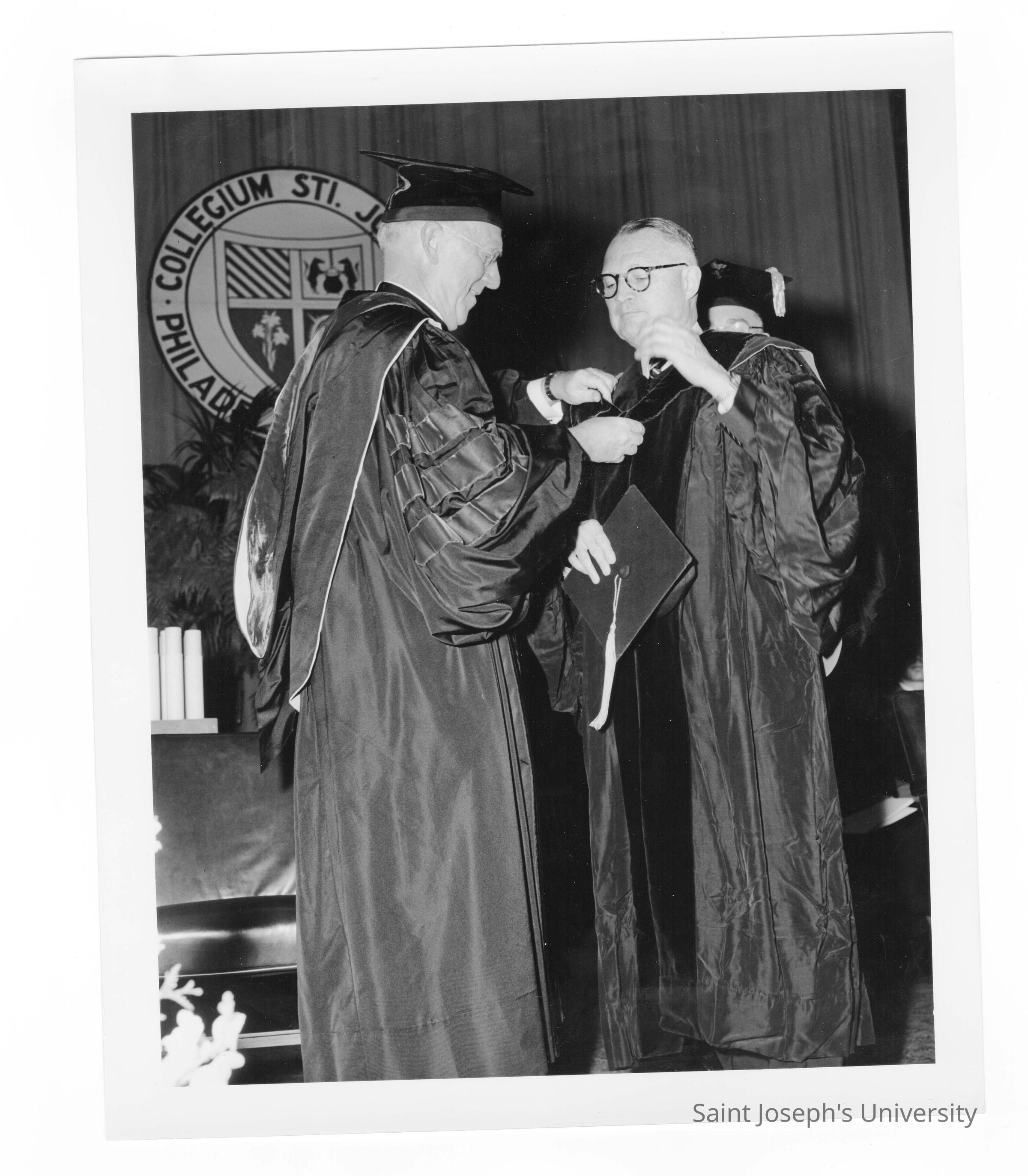 J. Joseph Bluett, S.J. conferring honorary degree to Gerald Flood during 1961 graduation/commencement.