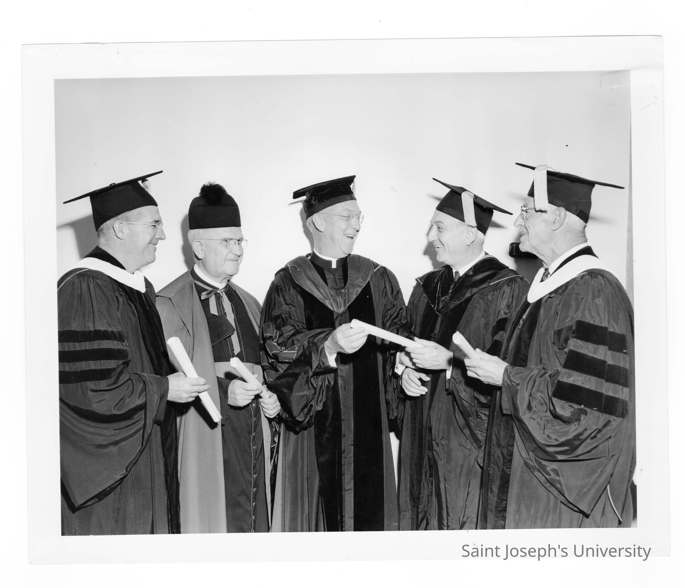J. Joseph Bluett, S.J., with four honorary degree recipients, Daniel Bernian, F.S.C., Monsignor Leo Fink, S.J., Judge Charles Klein, and Joseph Mattern during October 1961 graduation/commencement.