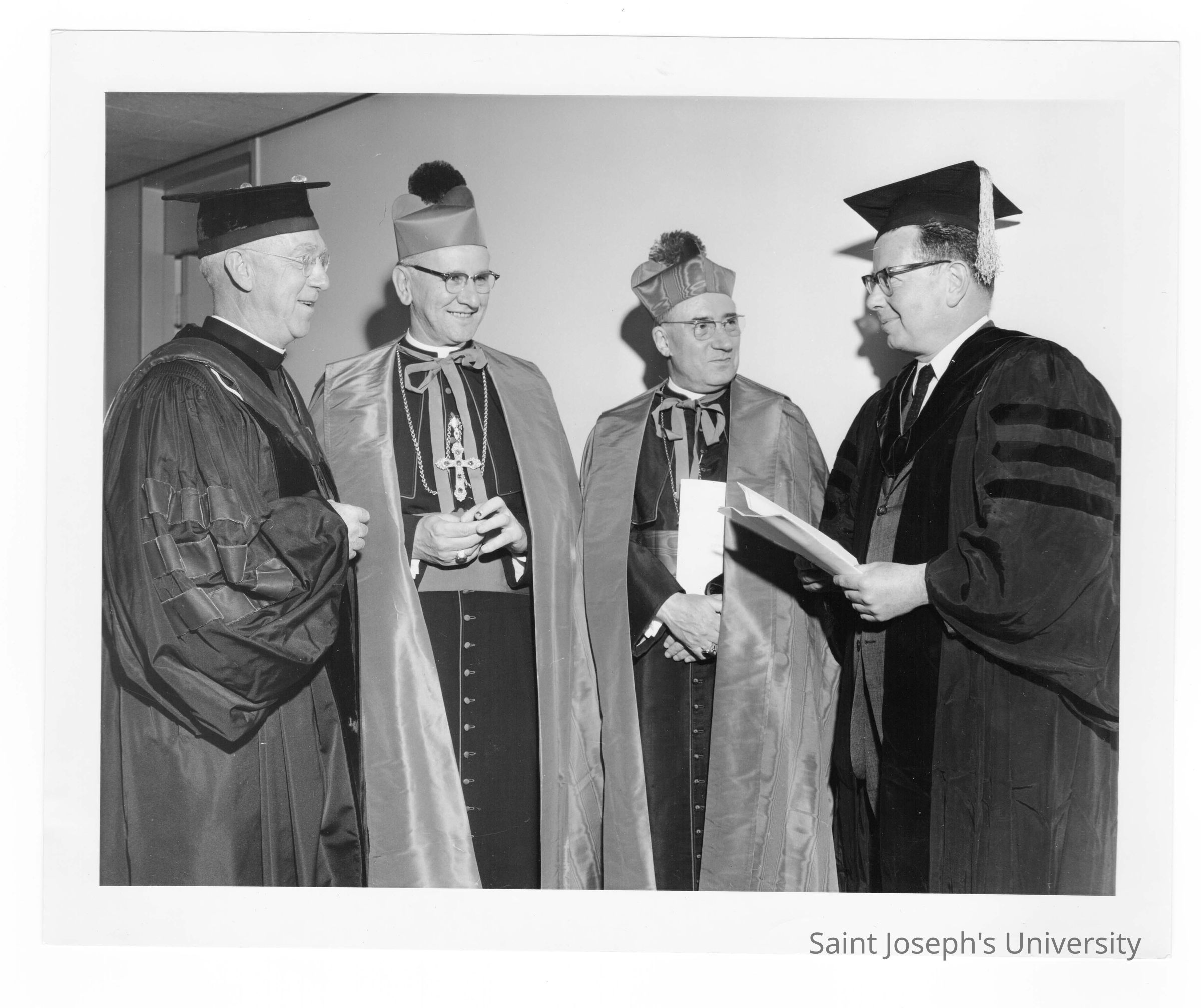 J. Joseph Bluett, S.J., and John Cardinal Krol with two honorary degree recipeints, Archbishop Egidio Vagnozzi and Richard J. Hughes at 1962 graduation/commencement.