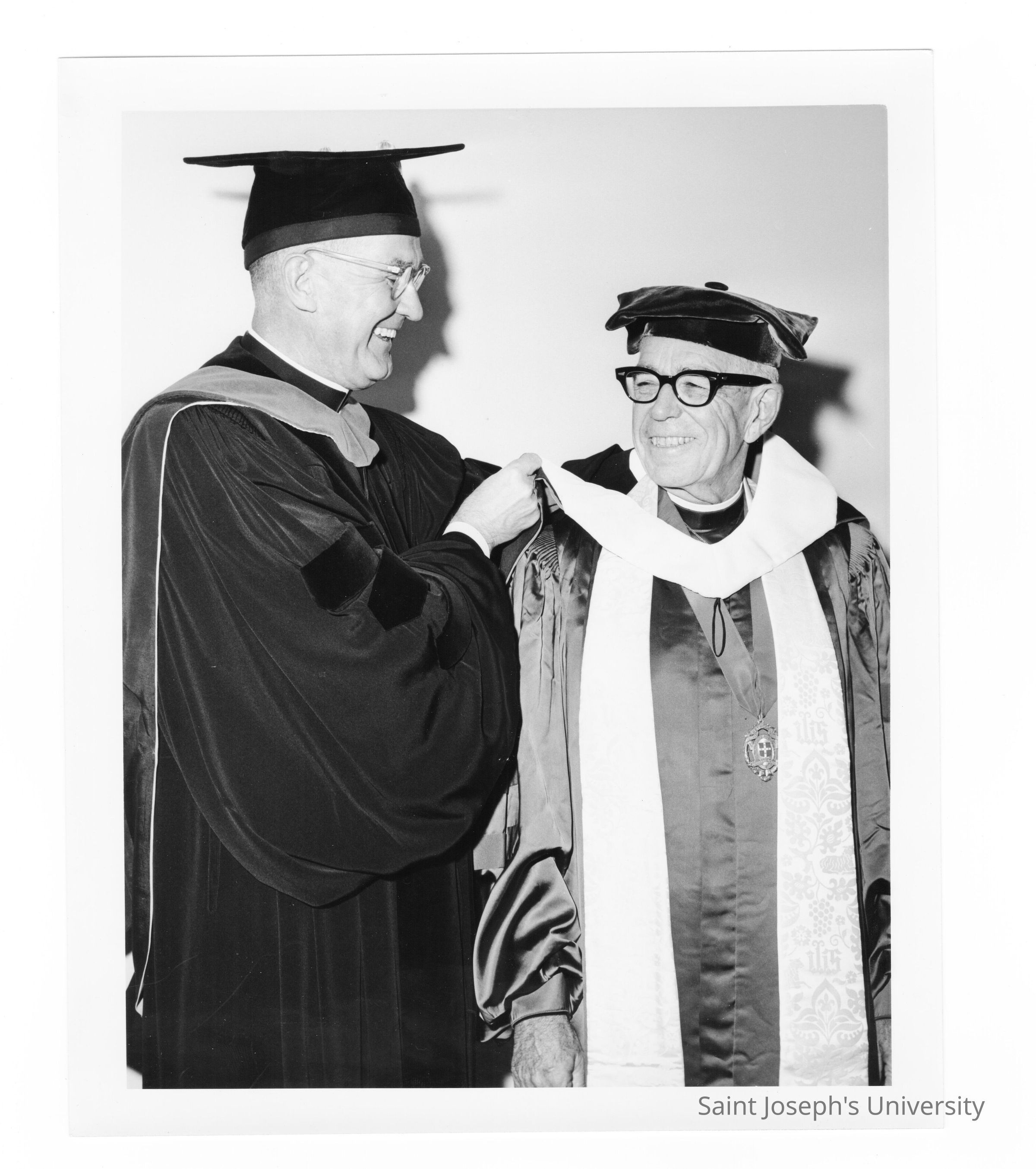 William F. Maloney, S.J., with honorary degree recipient Bishop Fred Pierce Corson, during October 1963 graduation/commencement.