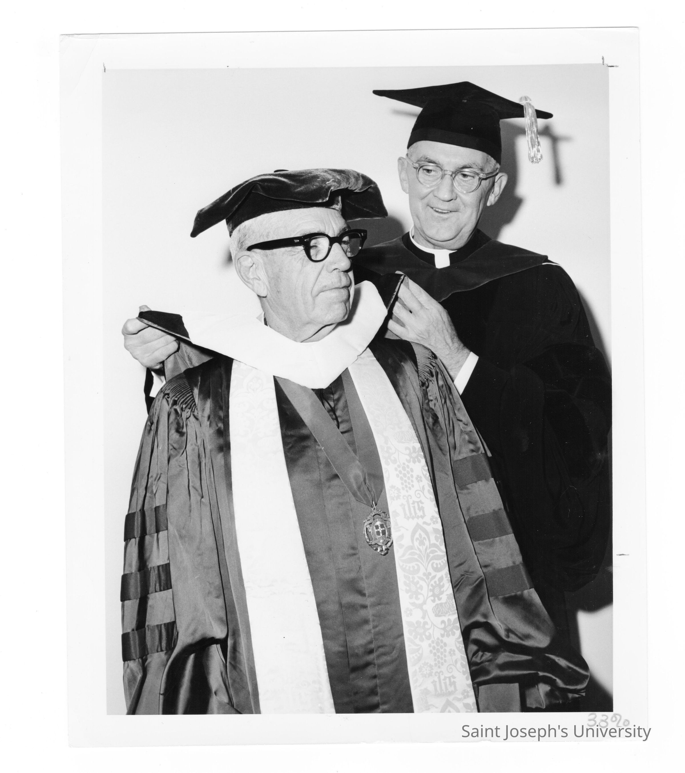 William F. Maloney, S.J., with honorary degree recipient Bishop Fred Pierce Corson, during October 1963 graduation/commencement.