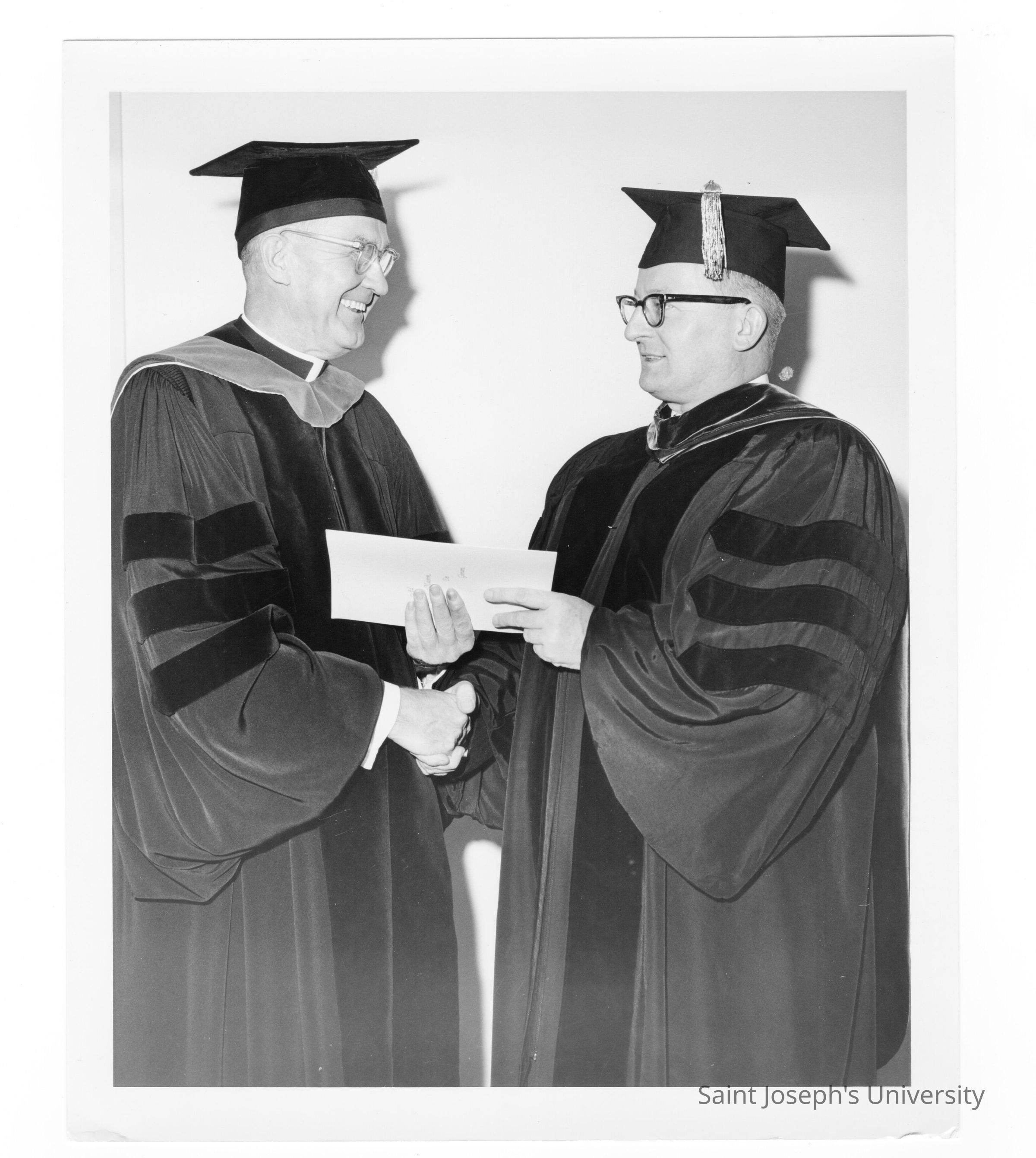 William F. Maloney, S.J., congratulating Dr. George Beichl, Chemistry Professor and recipient of Lindback Award, during October 1963 graduation/commencement.