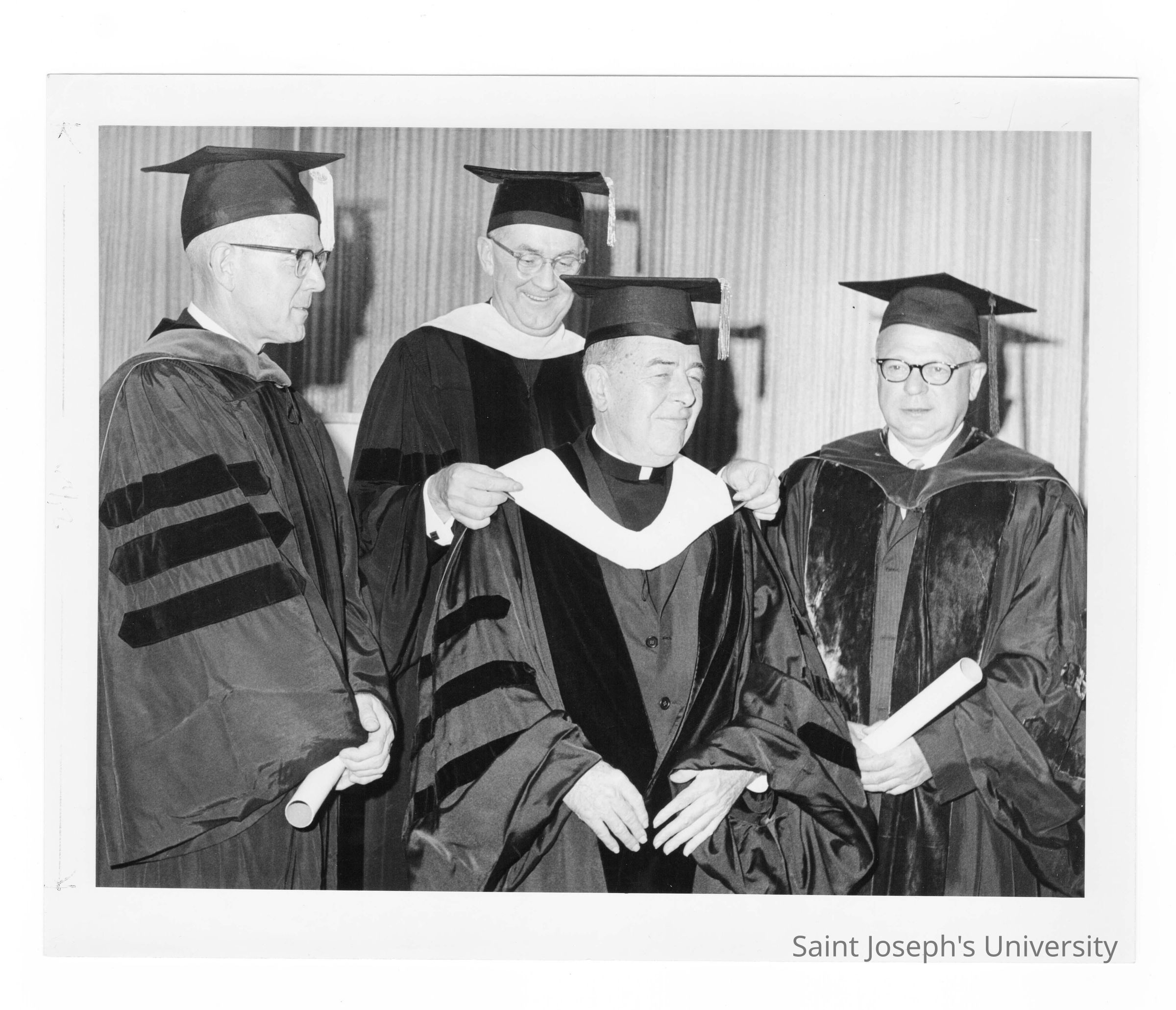 William F. Maloney, S.J., with three honorary degree recipients, Edward B. Bunn, S.J. (Chancellor of Georgetown University), Robert G. Dunlop, and Stuart T. Saunders during 1965 graduation/commencement.