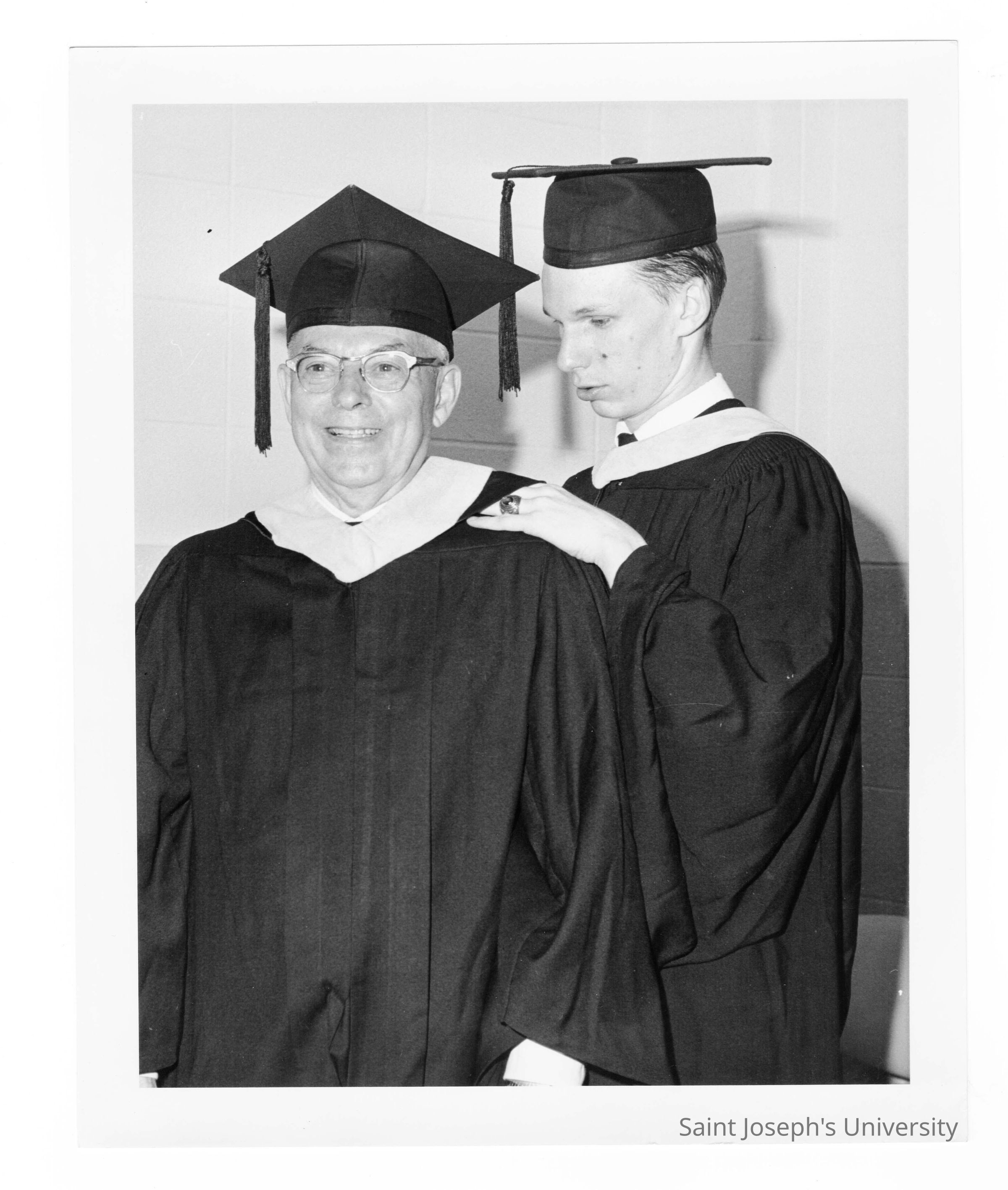 Two graduates, Alfred Baker and Thomas F. Finnegan, during 1966 graduation/commencement.
