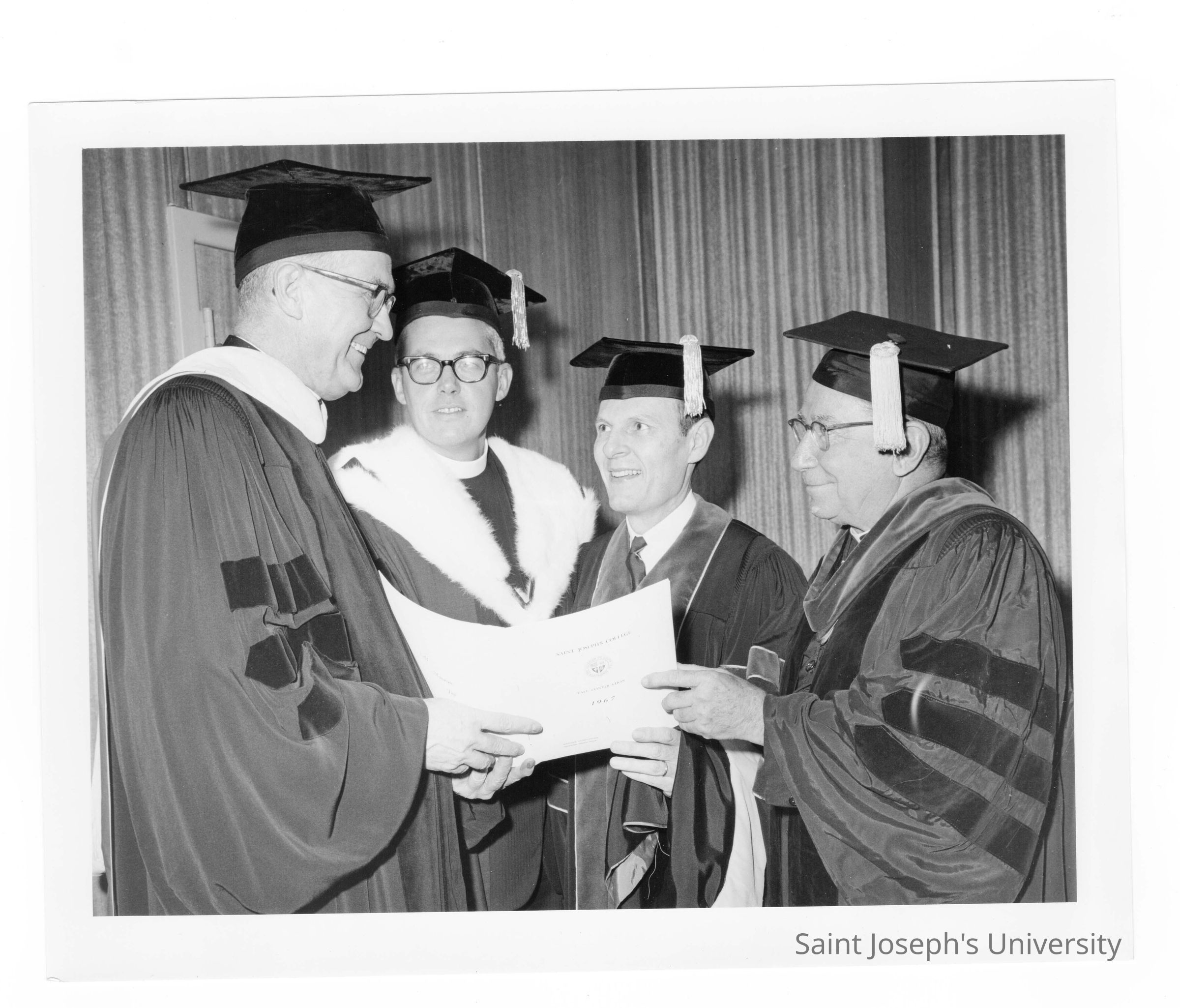 William F. Maloney, S.J., Jerome B. Coll, S.J., and John J. Coniff, S.J. with honorary degree recipient, William F. Kellow, during September 1967 graduation/commencement.