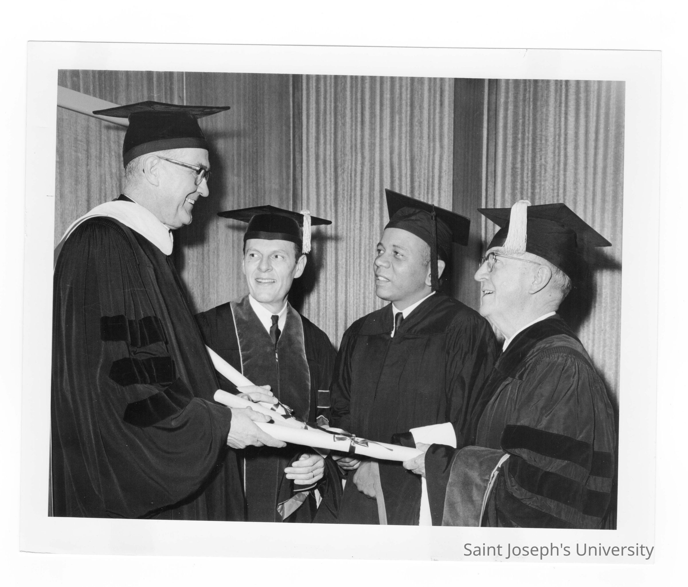 William F. Maloney, S.J., with three honorary degree recipients, William F. Kellow, M.D., Lawrence W. Pierce, and Joseph F. Burke during September 1967 graduation/commencement.