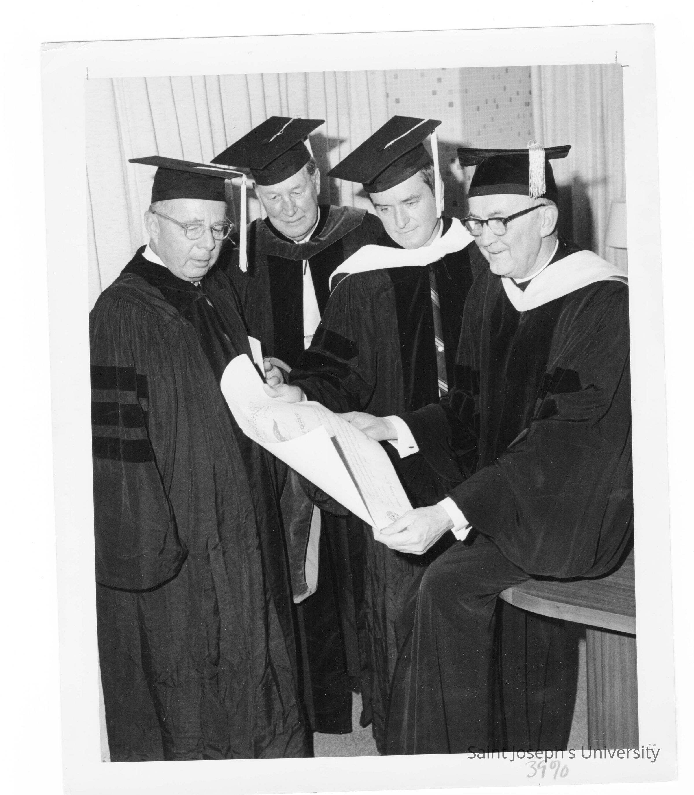 William F. Maloney, S.J., with three recipients of honorary degrees, Howard Butcher, III, Vincent P. McDevitt, and Mike Douglas during 1968 graduation/ceremony.
