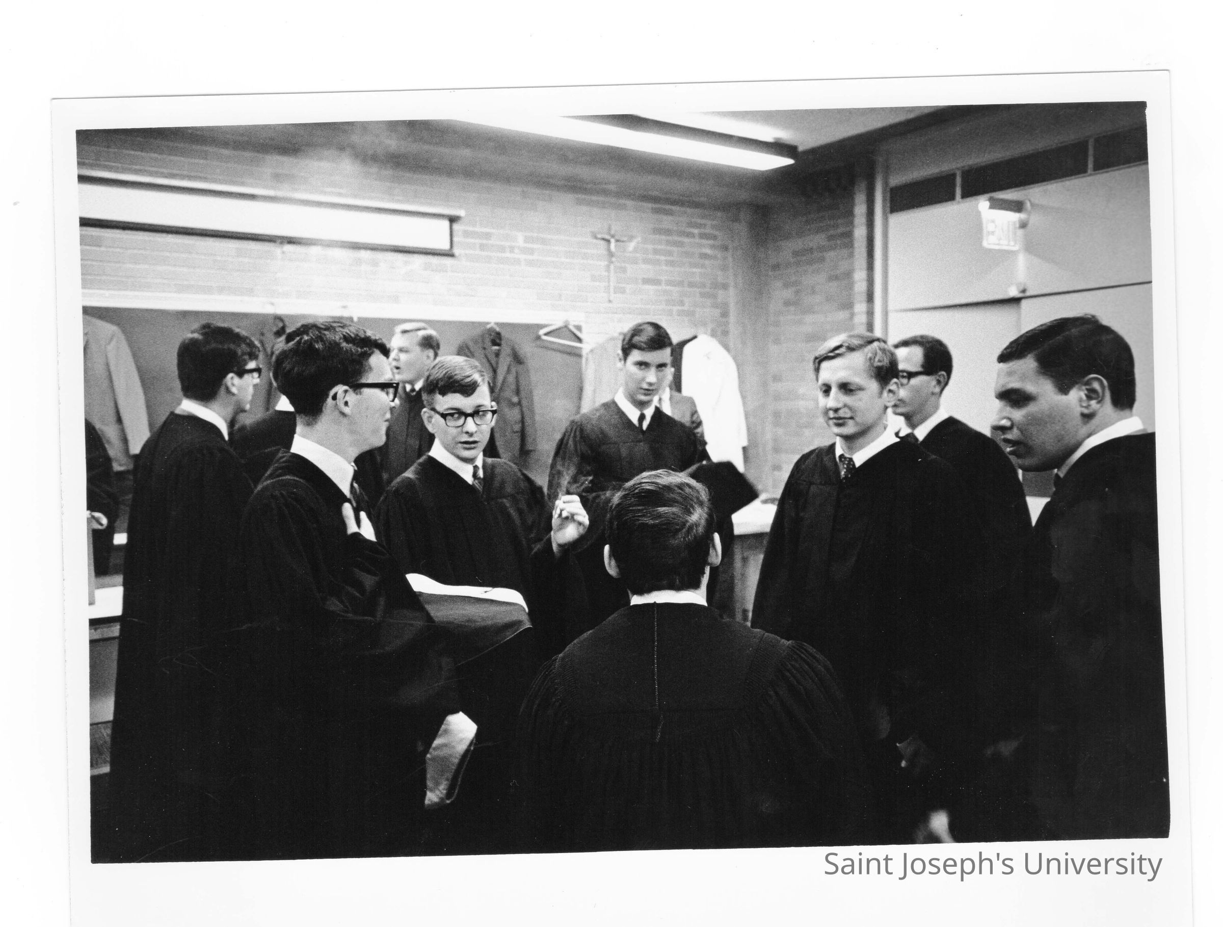Graduates putting on robes in Bellarmine classroom during 1968 graduation/commencement.
