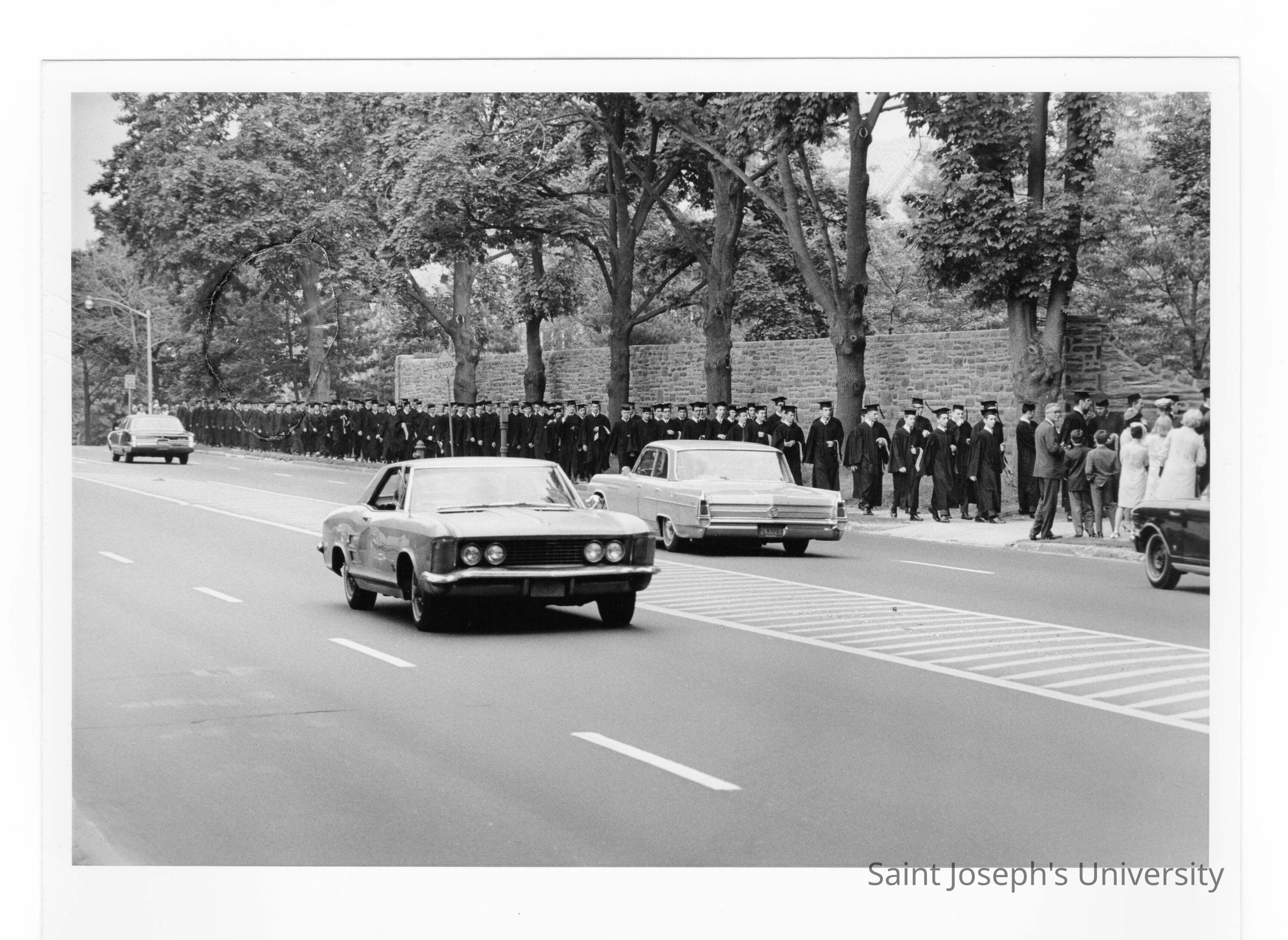 Graduates processing along City Avenue on way to 1968 graduation/commencement on Gest Lawn.