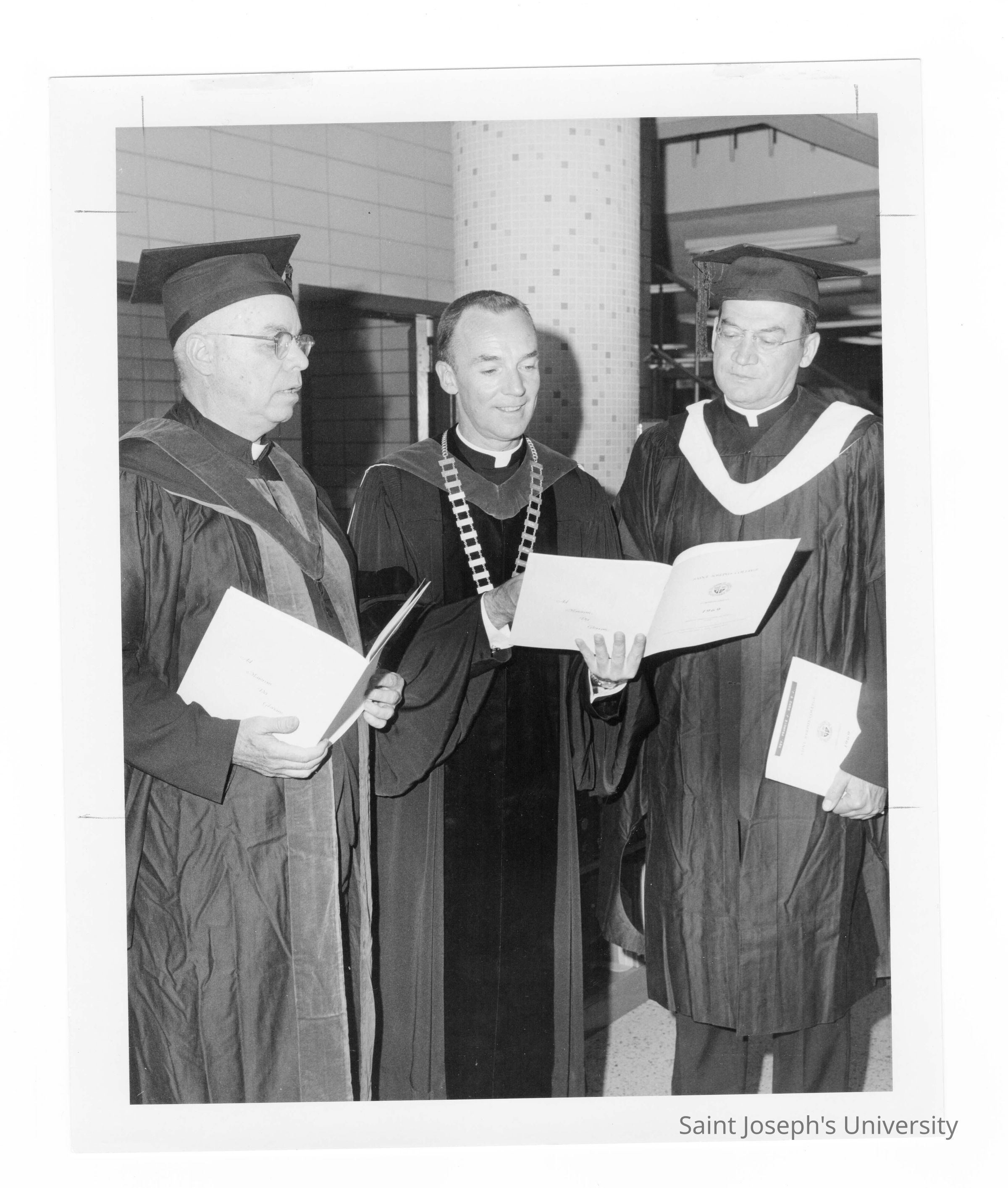 Terrence Toland, S.J., with two recipients of Bene Merenti Medal, Walter J. Handren, S.J., and Francis J. Renz, S.J. during 1969 graduation/commencement.