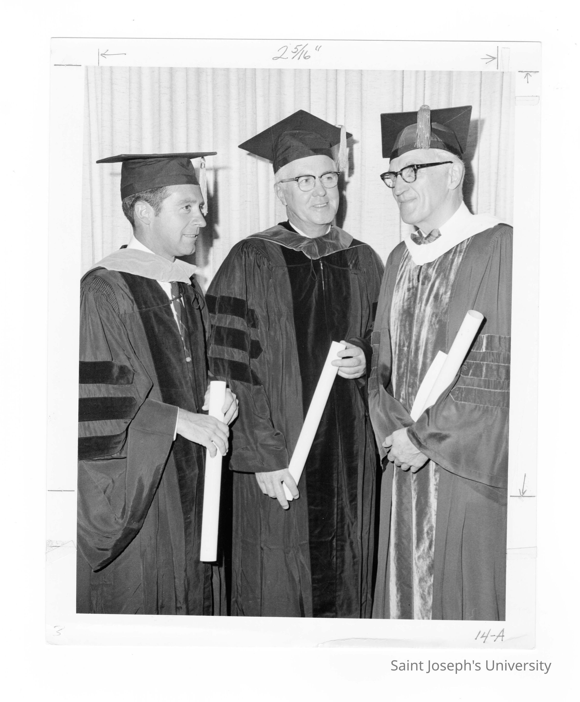 Three honorary degree recipients, John R. Bunting, Mayor James H. J. Tate, and Gaylord P. Harnwell during September 1969 graduation/commencement.