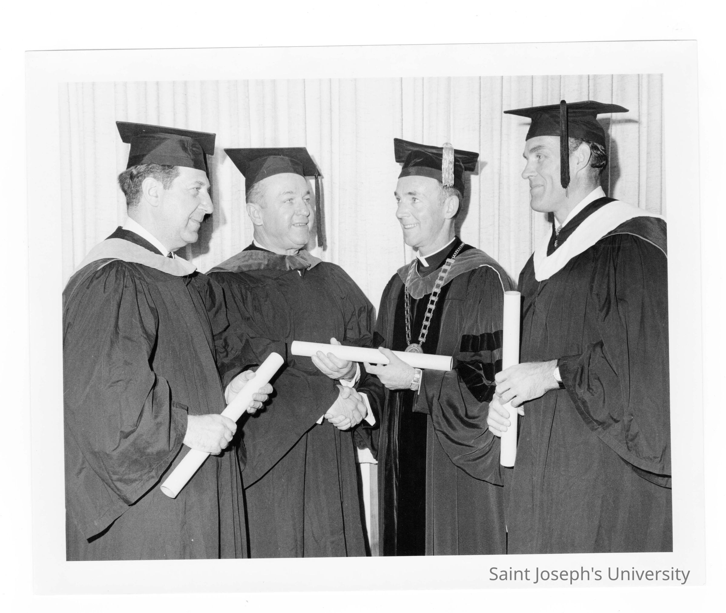 Terrence Toland, S.J., with three honorary degree recipients, Fred Hechinger, William T. Cahill, and Louis C. Fischer during 1970 graduation/commencement.